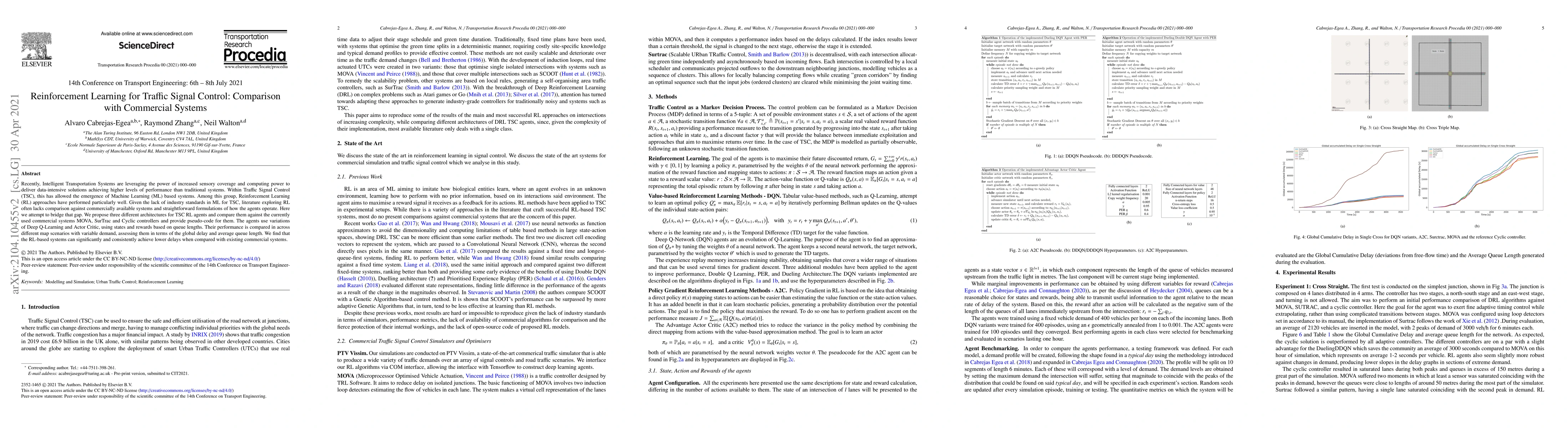 This research compares Reinforcement Learning (RL) traffic signal control agents with commercial systems MOVA, SurTrac, and Cyclic controllers. Three RL agent architectures using Deep Q-Learning and Actor Critic were tested across various map scenarios. Results indicate that RL-based systems consistently achieve lower global delays and average queue lengths compared to commercial systems.