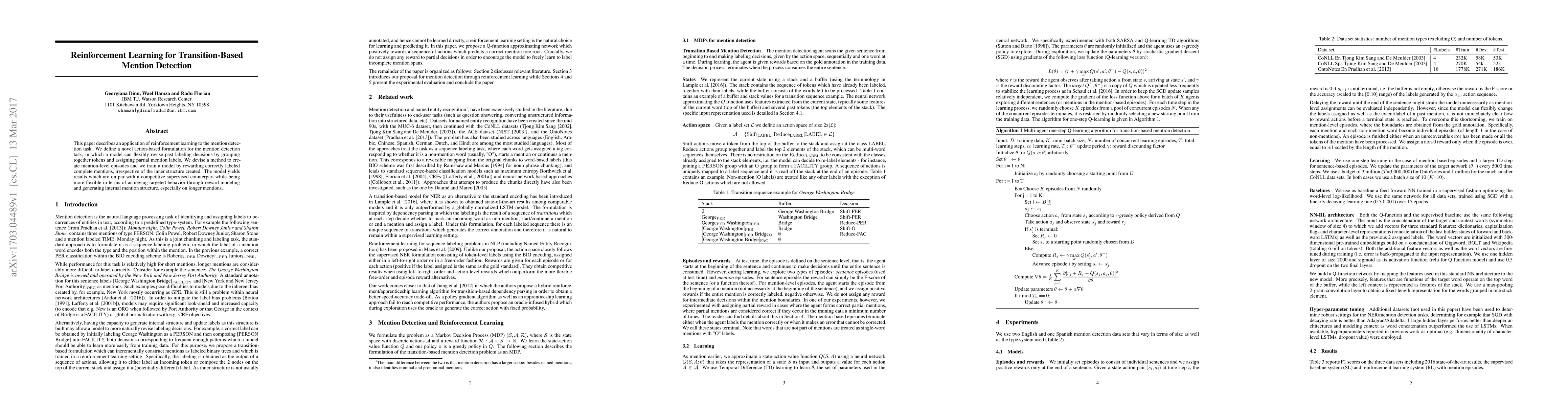 This paper describes an application of reinforcement learning to the mention detection task. We define a novel action-based formulation for the mention detection task, in which a model can flexibly revise past labeling decisions by grouping together tokens and assigning partial mention labels. We devise a method to create mention-level episodes and we train a model by rewarding correctly labeled complete mentions, irrespective of the inner structure created. The model yields results which are on par with a competitive supervised counterpart while being more flexible in terms of achieving targeted behavior through reward modeling and generating internal mention structure, especially on longer mentions.