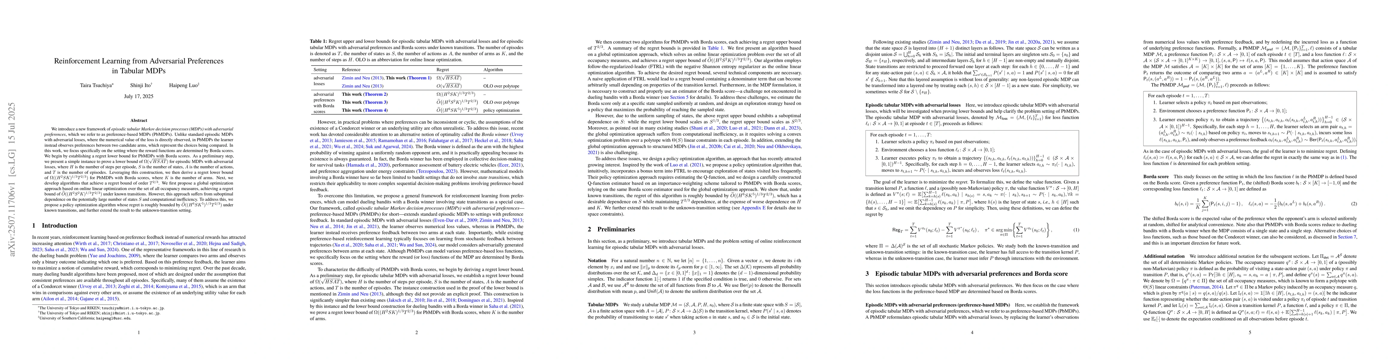 This research introduces Preference-based Markov Decision Processes (PbMDPs) for reinforcement learning with adversarial preferences, using Borda score-based reward functions. It establishes a regret lower bound for PbMDPs and develops algorithms with regret bounds of order T^(2/3), addressing both known and unknown transition scenarios.