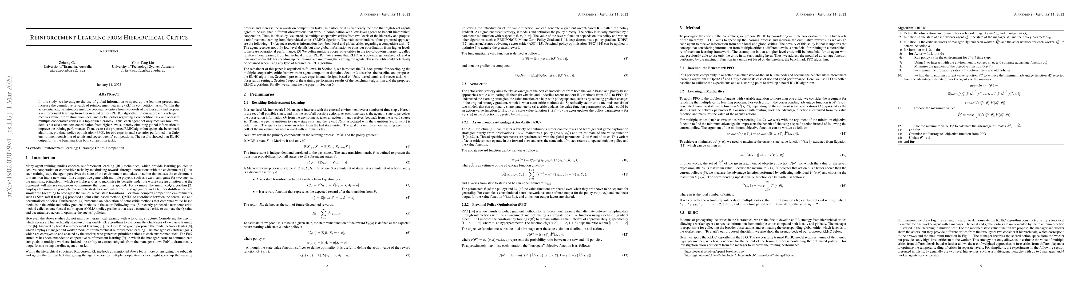 This study proposes a reinforcement learning algorithm called RLHC that uses hierarchical critics to provide global information, speeding up learning and improving performance in competition tasks. Compared to the PPO benchmark, RLHC showed superior results in Unity-based tennis and soccer competitions.