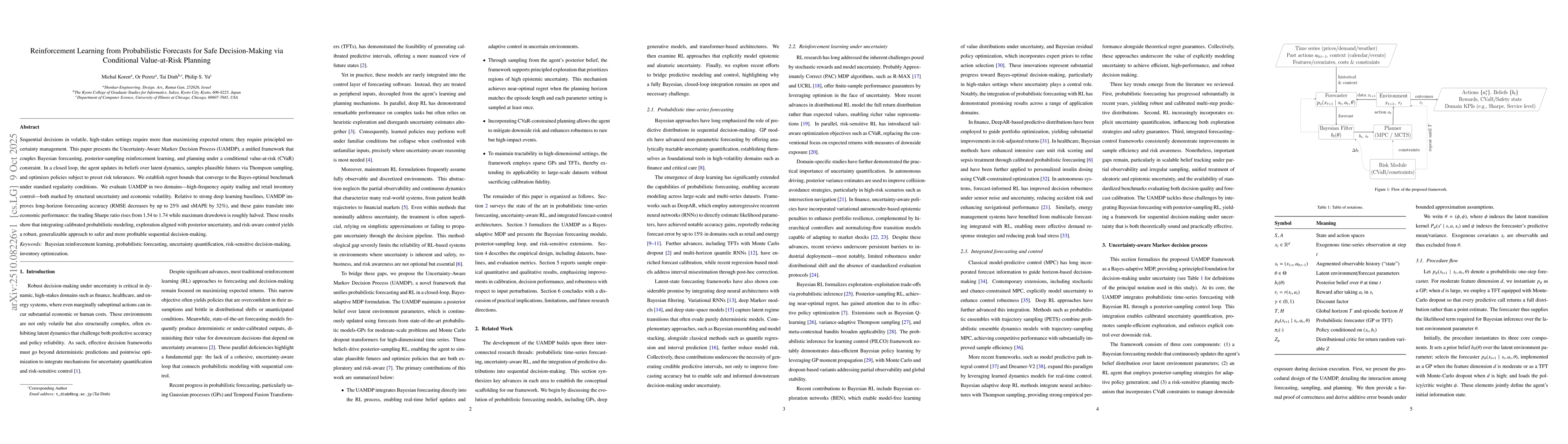 Sequential decisions in volatile, high-stakes settings require more than maximizing expected return; they require principled uncertainty management. This paper presents the Uncertainty-Aware Markov Decision Process (UAMDP), a unified framework that couples Bayesian forecasting, posterior-sampling reinforcement learning, and planning under a conditional value-at-risk (CVaR) constraint. In a closed loop, the agent updates its beliefs over latent dynamics, samples plausible futures via Thompson sampling, and optimizes policies subject to preset risk tolerances. We establish regret bounds that converge to the Bayes-optimal benchmark under standard regularity conditions. We evaluate UAMDP in two domains-high-frequency equity trading and retail inventory control-both marked by structural uncertainty and economic volatility. Relative to strong deep learning baselines, UAMDP improves long-horizon forecasting accuracy (RMSE decreases by up to 25\% and sMAPE by 32\%), and these gains translate into economic performance: the trading Sharpe ratio rises from 1.54 to 1.74 while maximum drawdown is roughly halved. These results show that integrating calibrated probabilistic modeling, exploration aligned with posterior uncertainty, and risk-aware control yields a robust, generalizable approach to safer and more profitable sequential decision-making.