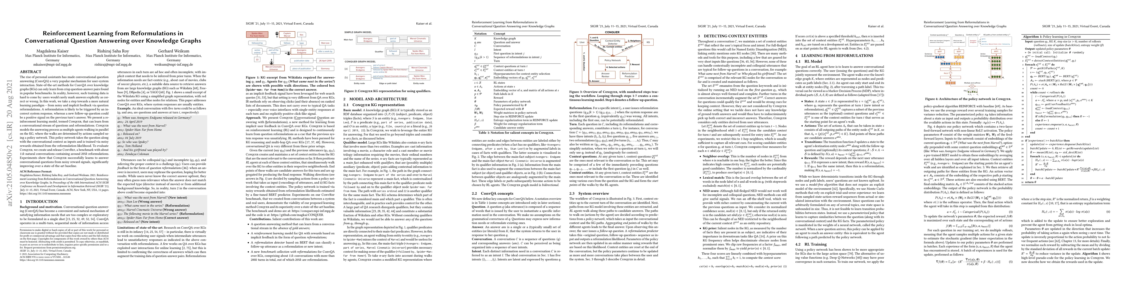This paper introduces CONQUER, a reinforcement learning model for conversational question answering over knowledge graphs, which learns from noisy and implicit feedback via question reformulations. CONQUER employs a policy network to navigate the knowledge graph based on reformulation likelihood, and a new benchmark ConvRef is created to evaluate its performance.