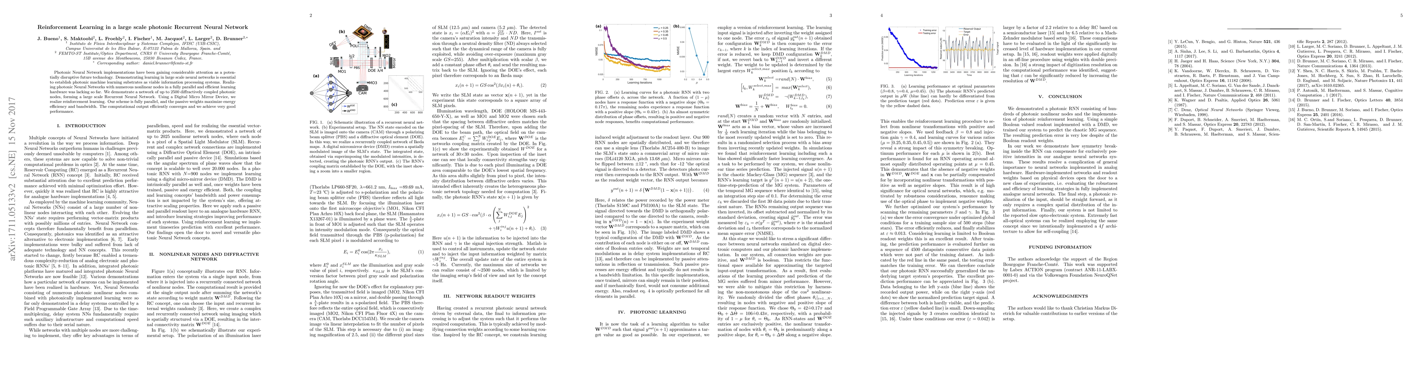 This paper demonstrates a large scale photonic Recurrent Neural Network with up to 2500 nodes, achieving reinforcement learning using a Digital Micro Mirror Device. The fully parallel scheme maximizes energy efficiency and bandwidth, showing efficient convergence and good performance.