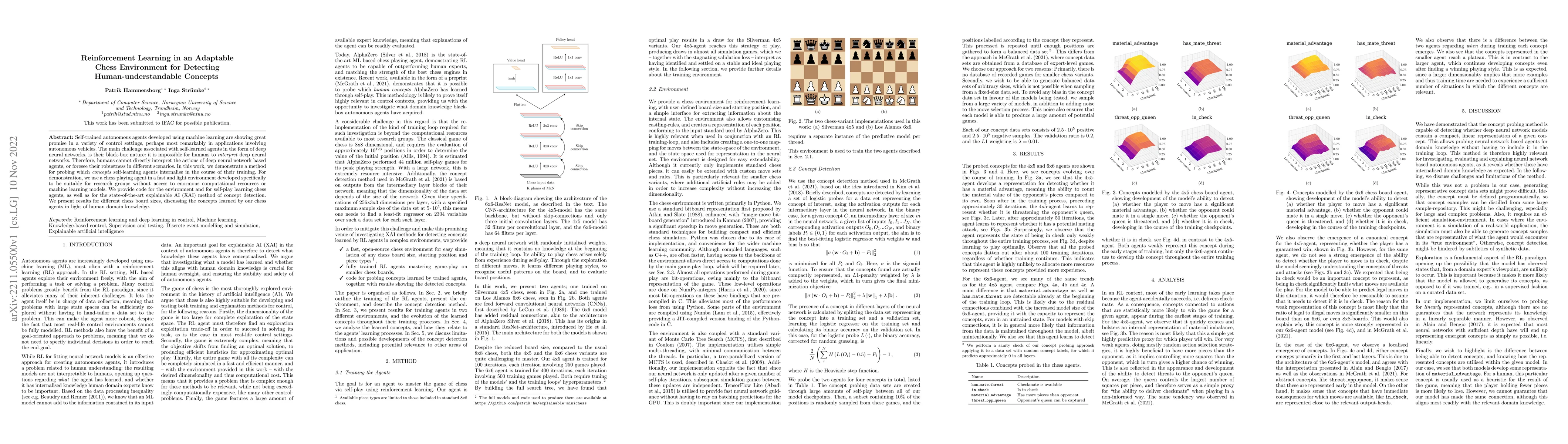 This paper explores reinforcement learning in a simplified chess environment to identify human-understandable concepts learned by self-trained agents. It aims to address the black-box nature of deep neural networks by making the learning process more interpretable.