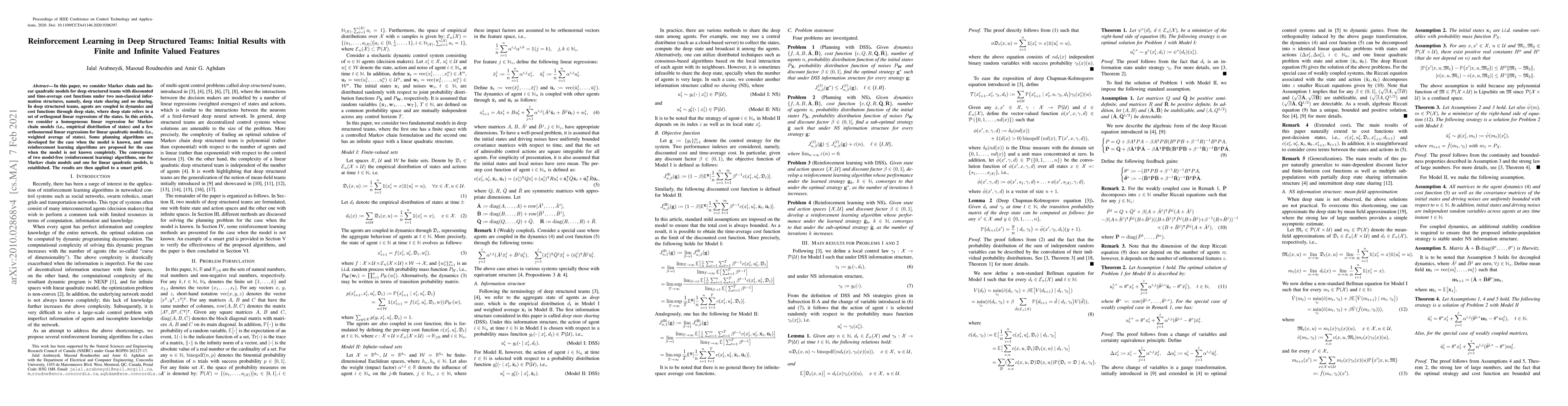 In this paper, we consider Markov chain and linear quadratic models for deep structured teams with discounted and time-average cost functions under two non-classical information structures, namely, deep state sharing and no sharing. In deep structured teams, agents are coupled in dynamics and cost functions through deep state, where deep state refers to a set of orthogonal linear regressions of the states. In this article, we consider a homogeneous linear regression for Markov chain models (i.e., empirical distribution of states) and a few orthonormal linear regressions for linear quadratic models (i.e., weighted average of states). Some planning algorithms are developed for the case when the model is known, and some reinforcement learning algorithms are proposed for the case when the model is not known completely. The convergence of two model-free (reinforcement learning) algorithms, one for Markov chain models and one for linear quadratic models, is established. The results are then applied to a smart grid.