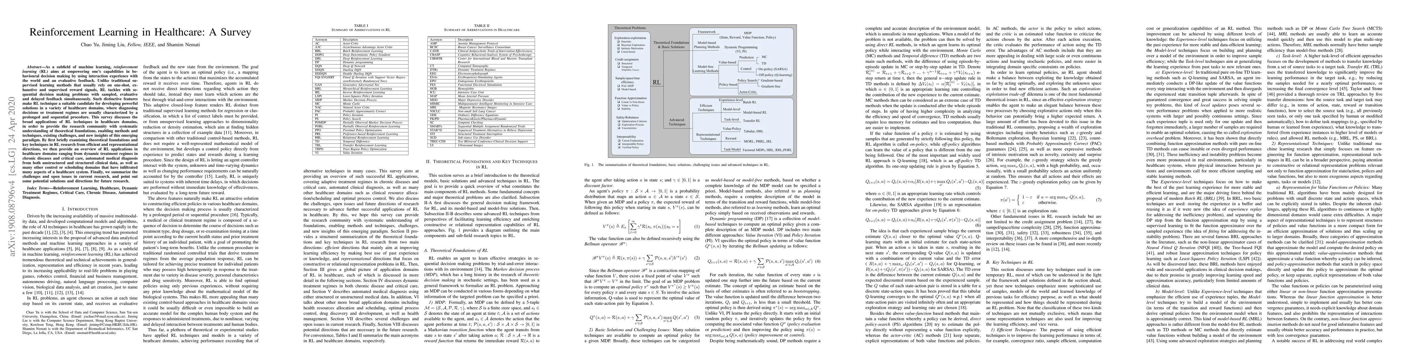 This paper surveys the applications of reinforcement learning (RL) in healthcare, highlighting its suitability for sequential decision-making processes. It discusses RL's theoretical foundations, enabling methods, and its use in dynamic treatment regimes, automated diagnosis, and other healthcare domains, while also addressing current challenges and future research directions.