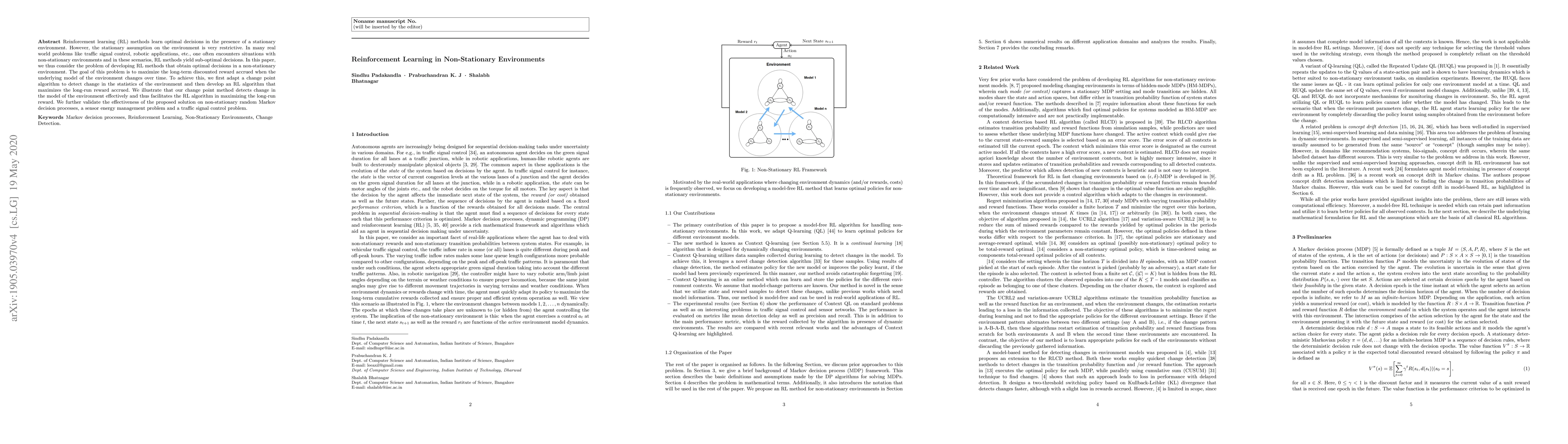 Reinforcement learning (RL) methods learn optimal decisions in the presence of a stationary environment. However, the stationary assumption on the environment is very restrictive. In many real world problems like traffic signal control, robotic applications, one often encounters situations with non-stationary environments and in these scenarios, RL methods yield sub-optimal decisions. In this paper, we thus consider the problem of developing RL methods that obtain optimal decisions in a non-stationary environment. The goal of this problem is to maximize the long-term discounted reward achieved when the underlying model of the environment changes over time. To achieve this, we first adapt a change point algorithm to detect change in the statistics of the environment and then develop an RL algorithm that maximizes the long-run reward accrued. We illustrate that our change point method detects change in the model of the environment effectively and thus facilitates the RL algorithm in maximizing the long-run reward. We further validate the effectiveness of the proposed solution on non-stationary random Markov decision processes, a sensor energy management problem and a traffic signal control problem.