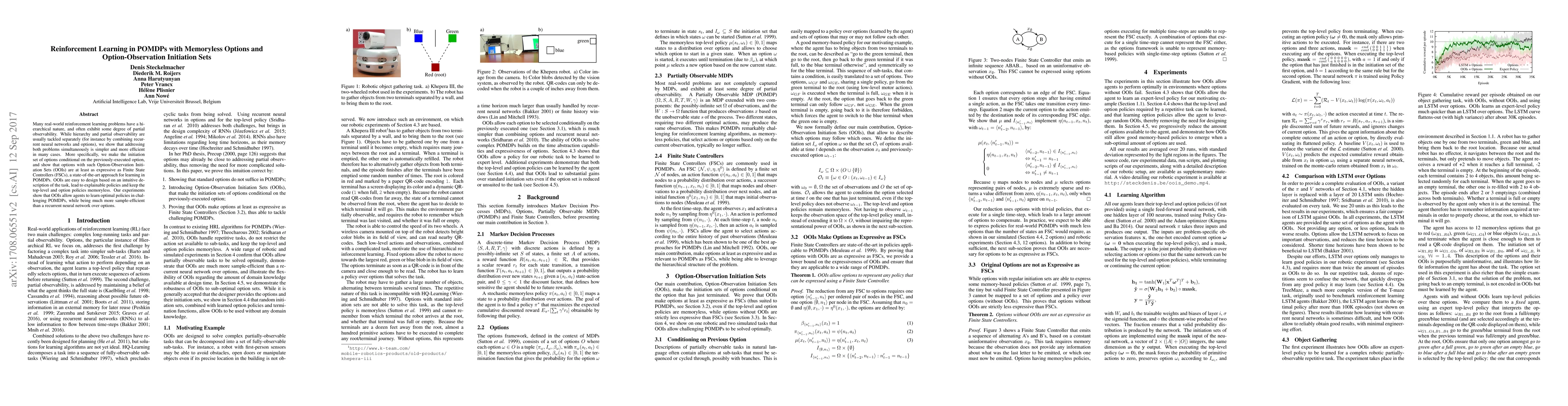 This paper proposes using memoryless options with Option-Observation Initiation Sets (OOIs) to address both hierarchical structure and partial observability in reinforcement learning problems framed as POMDPs. OOIs are shown to be at least as expressive as state-of-the-art Finite State Controllers (FSCs) while being more sample-efficient and easier to design.