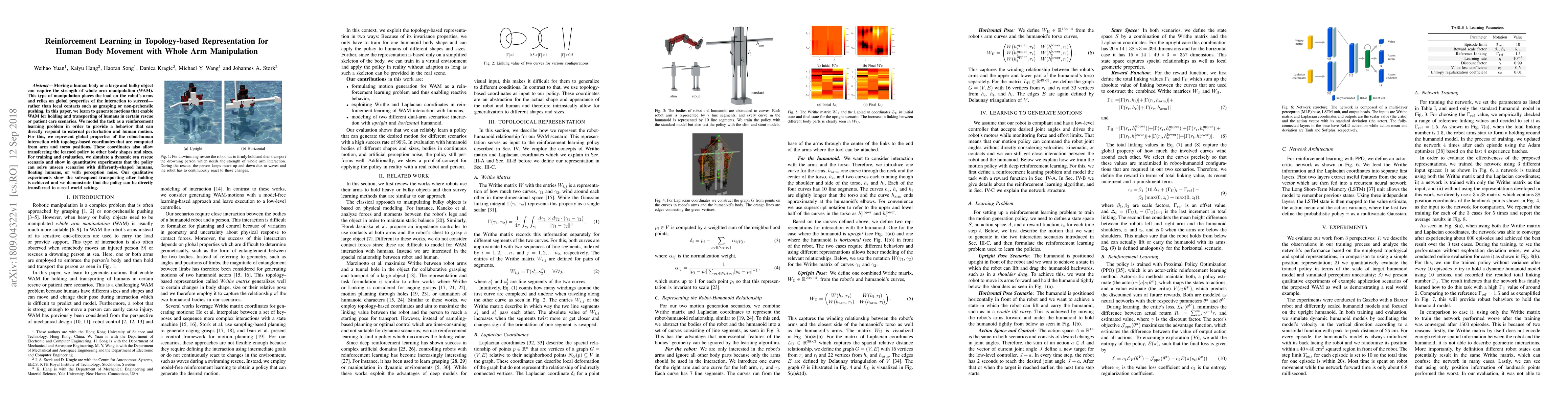 This paper develops a reinforcement learning approach to generate motions for whole arm manipulation (WAM) in human body movement, using topology-based representation to model global interaction properties. The approach is shown to effectively handle dynamic sea rescue scenarios in simulations and can generalize to different human shapes and sizes.