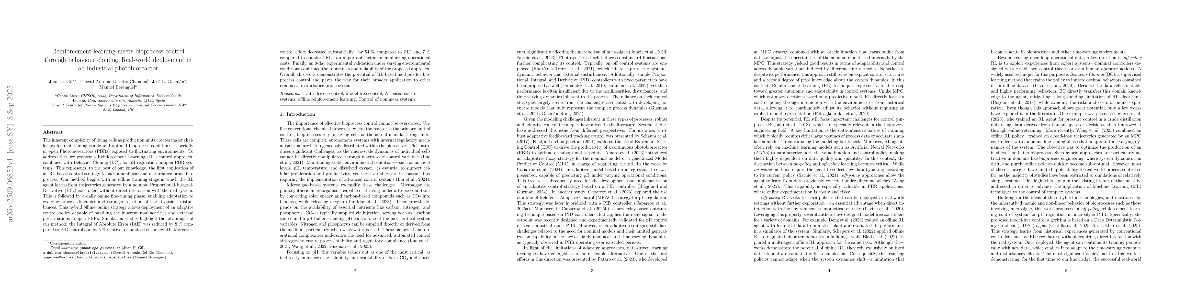 The inherent complexity of living cells as production units creates major challenges for maintaining stable and optimal bioprocess conditions, especially in open Photobioreactors (PBRs) exposed to fluctuating environments. To address this, we propose a Reinforcement Learning (RL) control approach, combined with Behavior Cloning (BC), for pH regulation in open PBR systems. This represents, to the best of our knowledge, the first application of an RL-based control strategy to such a nonlinear and disturbance-prone bioprocess. Our method begins with an offline training stage in which the RL agent learns from trajectories generated by a nominal Proportional-Integral-Derivative (PID) controller, without direct interaction with the real system. This is followed by a daily online fine-tuning phase, enabling adaptation to evolving process dynamics and stronger rejection of fast, transient disturbances. This hybrid offline-online strategy allows deployment of an adaptive control policy capable of handling the inherent nonlinearities and external perturbations in open PBRs. Simulation studies highlight the advantages of our method: the Integral of Absolute Error (IAE) was reduced by 8% compared to PID control and by 5% relative to standard off-policy RL. Moreover, control effort decreased substantially-by 54% compared to PID and 7% compared to standard RL-an important factor for minimizing operational costs. Finally, an 8-day experimental validation under varying environmental conditions confirmed the robustness and reliability of the proposed approach. Overall, this work demonstrates the potential of RL-based methods for bioprocess control and paves the way for their broader application to other nonlinear, disturbance-prone systems.