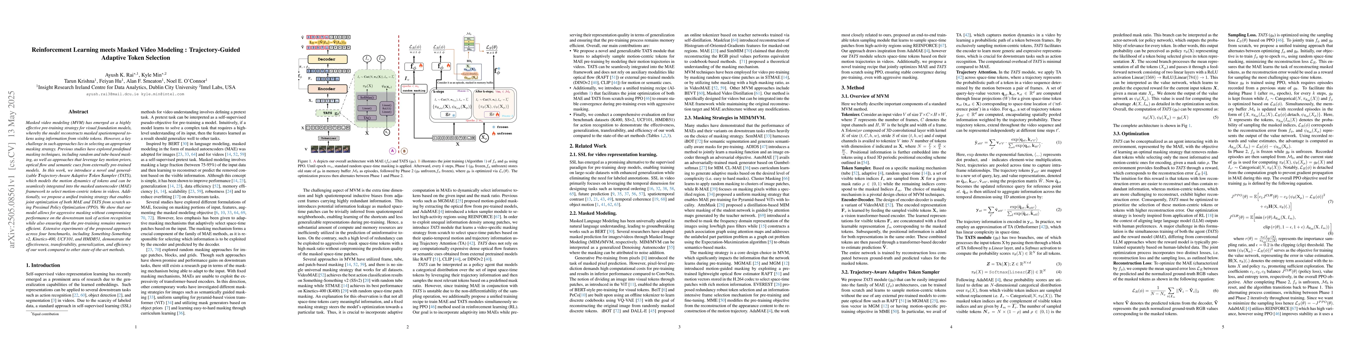 This research is novel by proposing a reinforcement learning-based adaptive token selection method (TATS) that models motion dynamics, distinct from predefined masking strategies and prior approaches leveraging motion priors, optical flow, or semantic cues from externally pre-trained models.