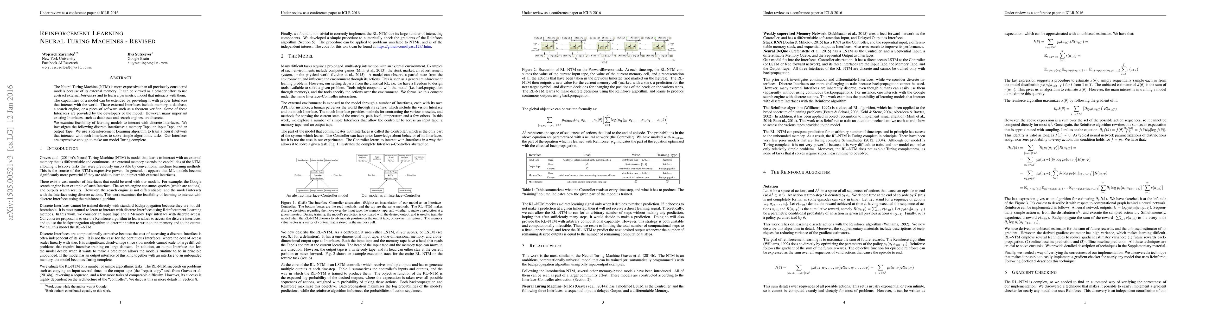 The Neural Turing Machine (NTM) is more expressive than all previously considered models because of its external memory. It can be viewed as a broader effort to use abstract external Interfaces and to learn a parametric model that interacts with them. The capabilities of a model can be extended by providing it with proper Interfaces that interact with the world. These external Interfaces include memory, a database, a search engine, or a piece of software such as a theorem verifier. Some of these Interfaces are provided by the developers of the model. However, many important existing Interfaces, such as databases and search engines, are discrete. We examine feasibility of learning models to interact with discrete Interfaces. We investigate the following discrete Interfaces: a memory Tape, an input Tape, and an output Tape. We use a Reinforcement Learning algorithm to train a neural network that interacts with such Interfaces to solve simple algorithmic tasks. Our Interfaces are expressive enough to make our model Turing complete.