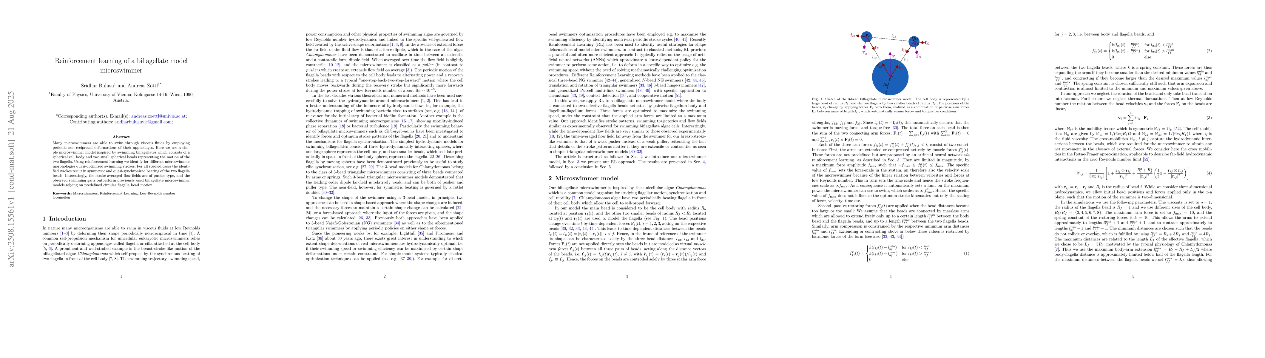 Many microswimmers are able to swim through viscous fluids by employing periodic non-reciprocal deformations of their appendages. Here we use a simple microswimmer model inspired by swimming biflagellates which consists of a spherical cell body and two small spherical beads representing the motion of the two flagella. Using reinforcement learning we identify for different microswimmer morphologies quasi-optimized swimming strokes. For all studied cases the identified strokes result in symmetric and quasi-synchronized beating of the two flagella beads. Interestingly, the stroke-averaged flow fields are of pusher type, and the observed swimming gaits outperform previously used biflagellate microswimmer models relying on predefined circular flagella bead motion.