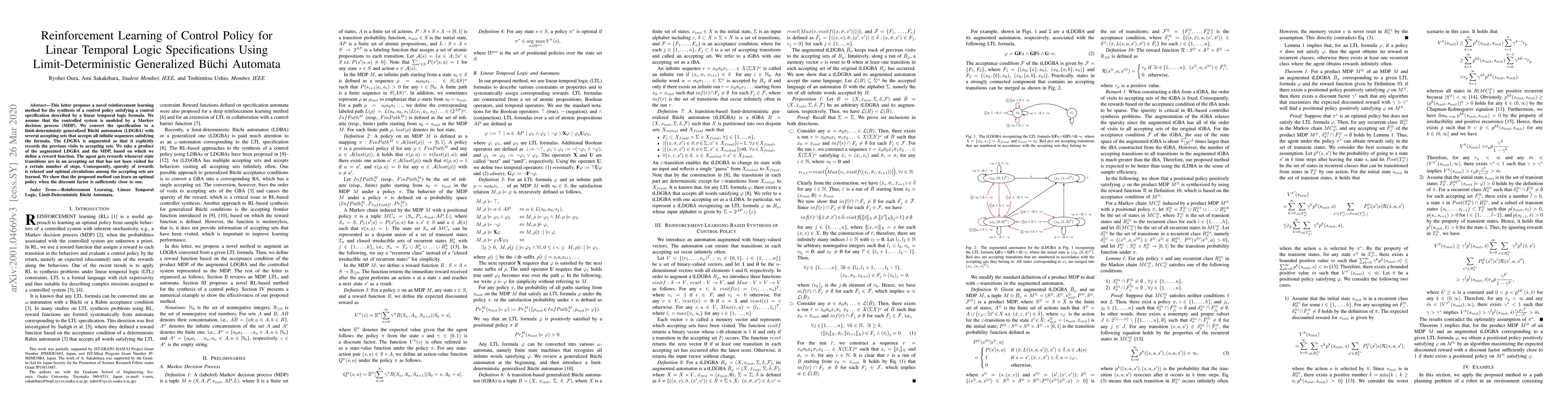 This paper introduces a reinforcement learning method for synthesizing control policies that meet linear temporal logic specifications, using limit-deterministic generalized B\"uchi automata. The method learns optimal circulations among the automaton's accepting sets, achieving policy optimality when the discount factor is near one.