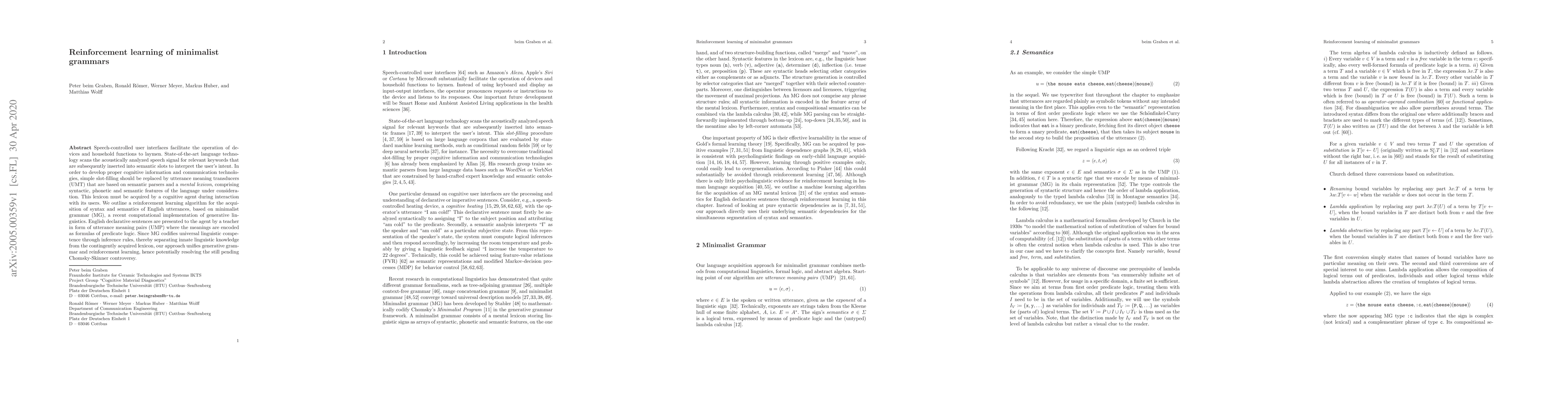 Speech-controlled user interfaces facilitate the operation of devices and household functions to laymen. State-of-the-art language technology scans the acoustically analyzed speech signal for relevant keywords that are subsequently inserted into semantic slots to interpret the user's intent. In order to develop proper cognitive information and communication technologies, simple slot-filling should be replaced by utterance meaning transducers (UMT) that are based on semantic parsers and a mental lexicon, comprising syntactic, phonetic and semantic features of the language under consideration. This lexicon must be acquired by a cognitive agent during interaction with its users. We outline a reinforcement learning algorithm for the acquisition of syntax and semantics of English utterances, based on minimalist grammar (MG), a recent computational implementation of generative linguistics. English declarative sentences are presented to the agent by a teacher in form of utterance meaning pairs (UMP) where the meanings are encoded as formulas of predicate logic. Since MG codifies universal linguistic competence through inference rules, thereby separating innate linguistic knowledge from the contingently acquired lexicon, our approach unifies generative grammar and reinforcement learning, hence potentially resolving the still pending Chomsky-Skinner controversy.