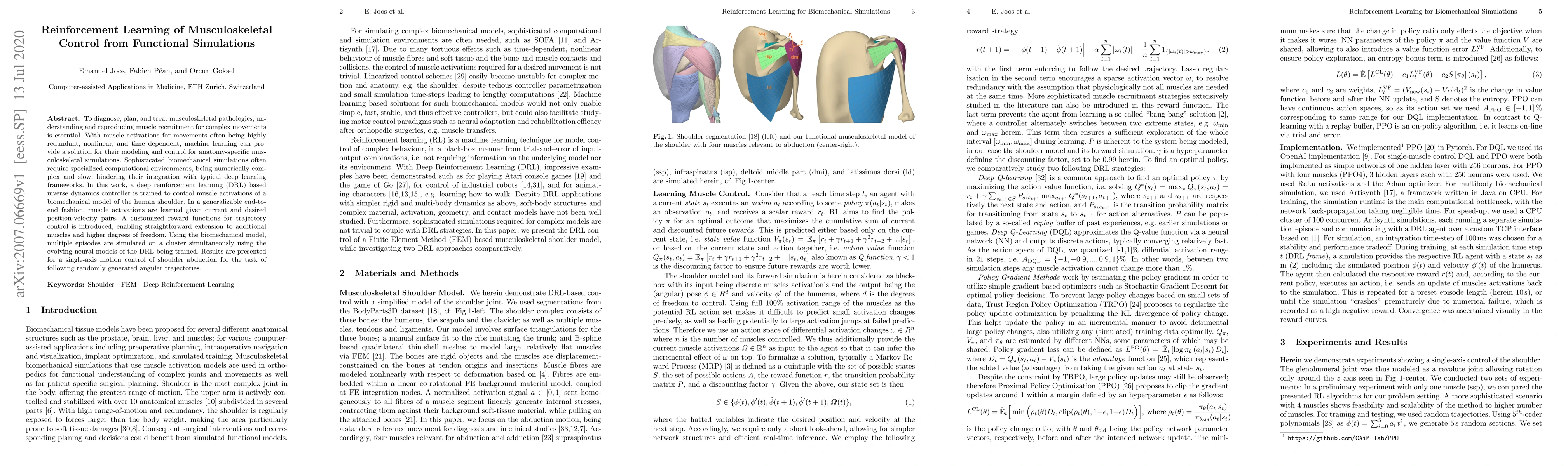 To diagnose, plan, and treat musculoskeletal pathologies, understanding and reproducing muscle recruitment for complex movements is essential. With muscle activations for movements often being highly redundant, nonlinear, and time dependent, machine learning can provide a solution for their modeling and control for anatomy-specific musculoskeletal simulations. Sophisticated biomechanical simulations often require specialized computational environments, being numerically complex and slow, hindering their integration with typical deep learning frameworks. In this work, a deep reinforcement learning (DRL) based inverse dynamics controller is trained to control muscle activations of a biomechanical model of the human shoulder. In a generalizable end-to-end fashion, muscle activations are learned given current and desired position-velocity pairs. A customized reward functions for trajectory control is introduced, enabling straightforward extension to additional muscles and higher degrees of freedom. Using the biomechanical model, multiple episodes are simulated on a cluster simultaneously using the evolving neural models of the DRL being trained. Results are presented for a single-axis motion control of shoulder abduction for the task of following randomly generated angular trajectories.