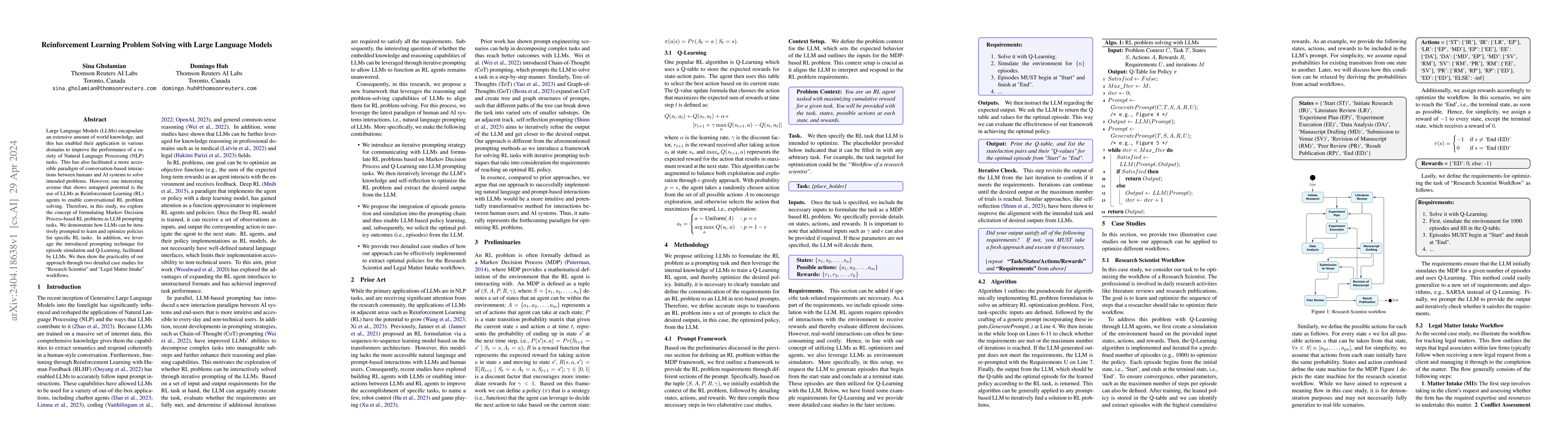 This study investigates using Large Language Models (LLMs) as Reinforcement Learning (RL) agents to solve complex problems conversationally. The research formulates RL problems as LLM prompting tasks and demonstrates their efficacy through practical case studies in research and legal workflows.