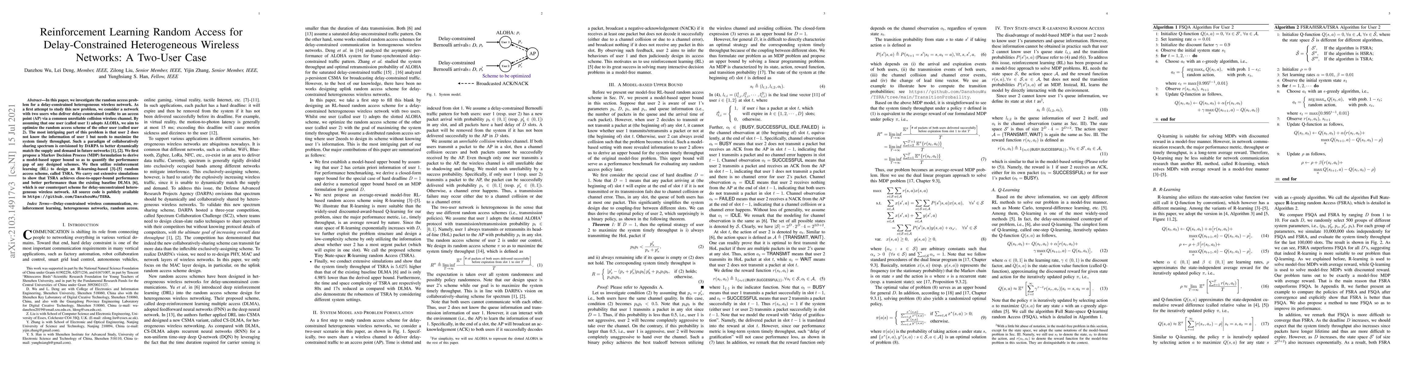 This research proposes a reinforcement learning-based random access scheme, TSRA, for a two-user delay-constrained heterogeneous wireless network. TSRA outperforms the baseline DLMA scheme, achieving near-optimal performance through an MDP formulation and R-learning, addressing spectrum sharing for dynamic supply-demand matching.