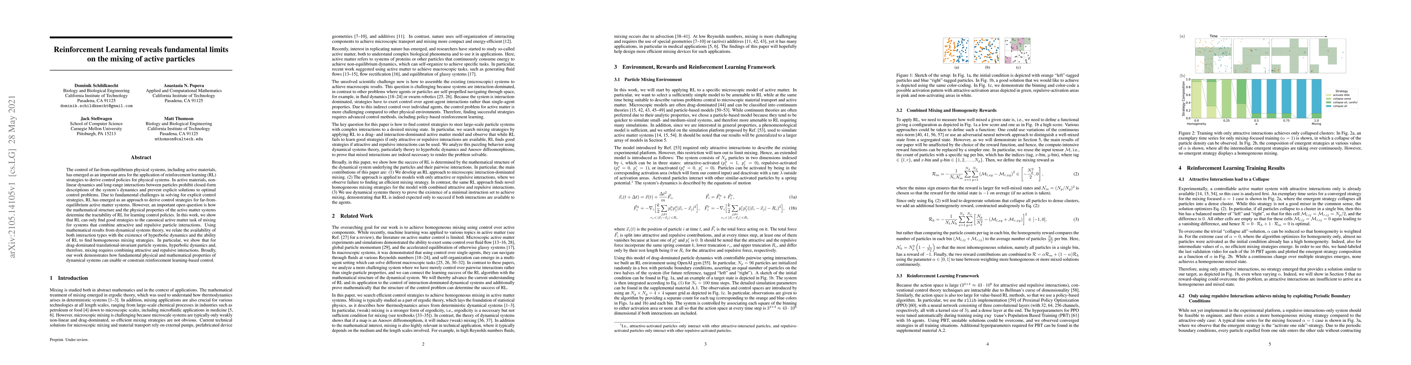 The control of far-from-equilibrium physical systems, including active materials, has emerged as an important area for the application of reinforcement learning (RL) strategies to derive control policies for physical systems. In active materials, non-linear dynamics and long-range interactions between particles prohibit closed-form descriptions of the system's dynamics and prevent explicit solutions to optimal control problems. Due to fundamental challenges in solving for explicit control strategies, RL has emerged as an approach to derive control strategies for far-from-equilibrium active matter systems. However, an important open question is how the mathematical structure and the physical properties of the active matter systems determine the tractability of RL for learning control policies. In this work, we show that RL can only find good strategies to the canonical active matter task of mixing for systems that combine attractive and repulsive particle interactions. Using mathematical results from dynamical systems theory, we relate the availability of both interaction types with the existence of hyperbolic dynamics and the ability of RL to find homogeneous mixing strategies. In particular, we show that for drag-dominated translational-invariant particle systems, hyperbolic dynamics and, therefore, mixing requires combining attractive and repulsive interactions. Broadly, our work demonstrates how fundamental physical and mathematical properties of dynamical systems can enable or constrain reinforcement learning-based control.