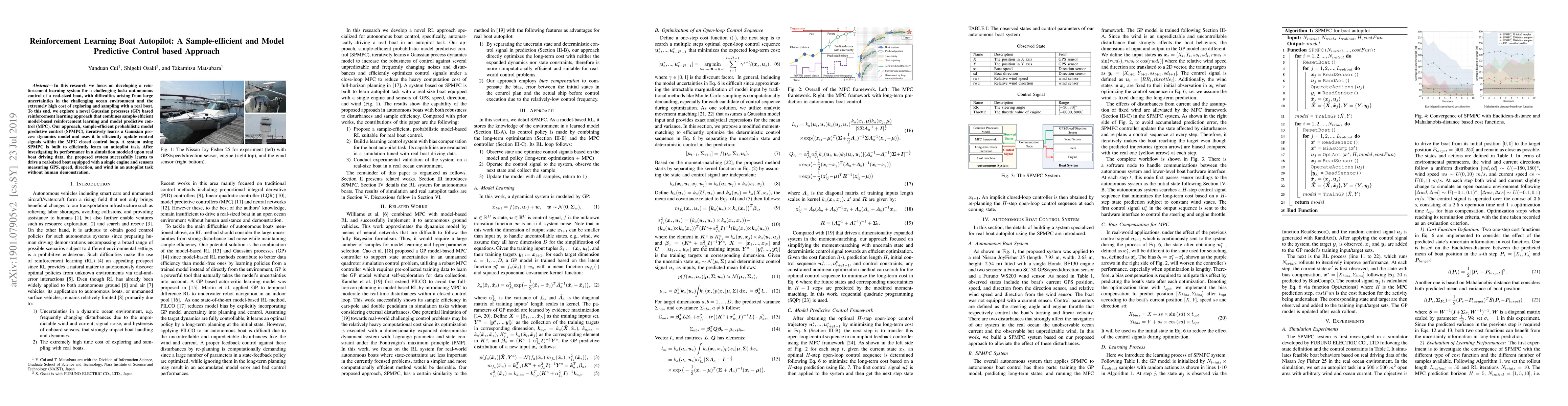 This research develops a reinforcement learning system for autonomous boat control using a sample-efficient Gaussian processes-based approach that combines model-based reinforcement learning and model predictive control. The proposed SPMPC method iteratively learns a dynamics model to efficiently update control signals, successfully enabling an autopilot to navigate a real-sized boat without human demonstration.