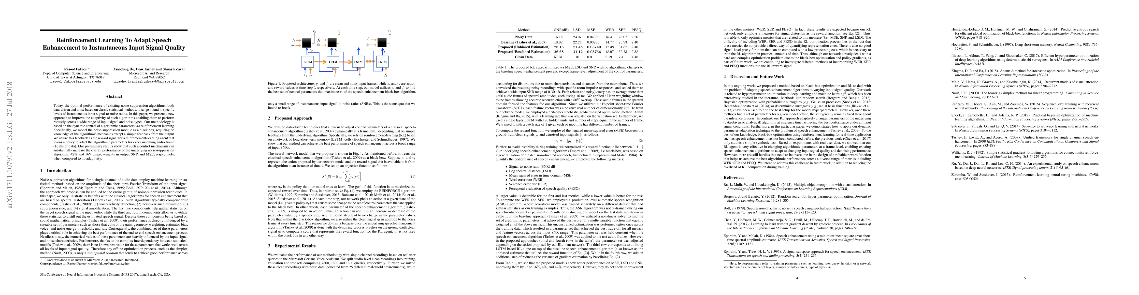 Researchers developed an approach using reinforcement learning to adapt speech enhancement algorithms to changing input signal quality, achieving 42% and 16% improvements in output SNR and MSE.
