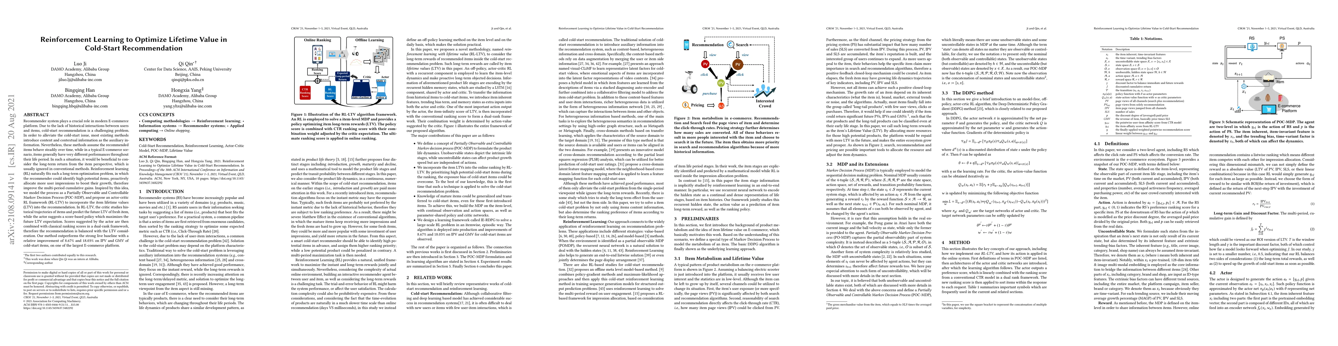 This research paper proposes a novel reinforcement learning framework to optimize lifetime value in cold-start recommendations for e-commerce platforms, outperforming strong baselines with significant improvements.