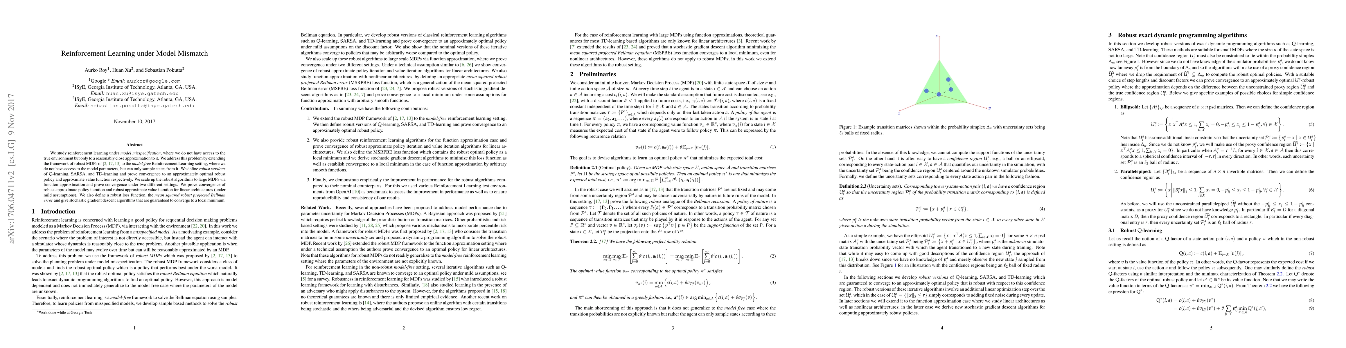 We study reinforcement learning under model misspecification, where we do not have access to the true environment but only to a reasonably close approximation to it. We address this problem by extending the framework of robust MDPs to the model-free Reinforcement Learning setting, where we do not have access to the model parameters, but can only sample states from it. We define robust versions of Q-learning, SARSA, and TD-learning and prove convergence to an approximately optimal robust policy and approximate value function respectively. We scale up the robust algorithms to large MDPs via function approximation and prove convergence under two different settings. We prove convergence of robust approximate policy iteration and robust approximate value iteration for linear architectures (under mild assumptions). We also define a robust loss function, the mean squared robust projected Bellman error and give stochastic gradient descent algorithms that are guaranteed to converge to a local minimum.