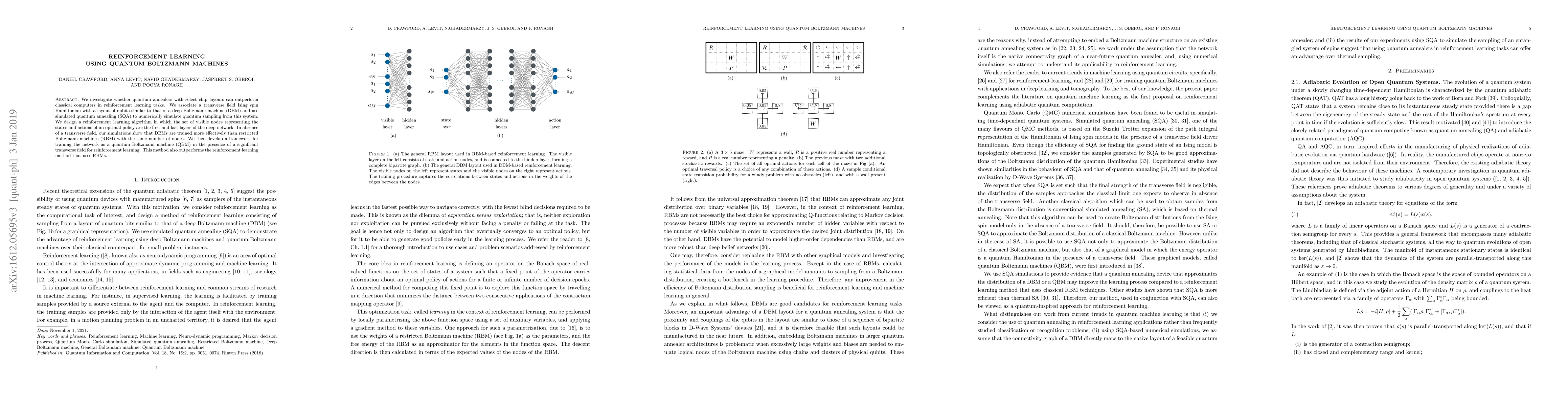 This paper explores the potential of quantum annealers to outperform classical computers in reinforcement learning tasks using quantum Boltzmann machines. The study finds that quantum sampling via simulated quantum annealing can train deep Boltzmann machines more effectively than restricted Boltzmann machines, and introduces a framework for training quantum Boltzmann machines that also shows superior performance in reinforcement learning.