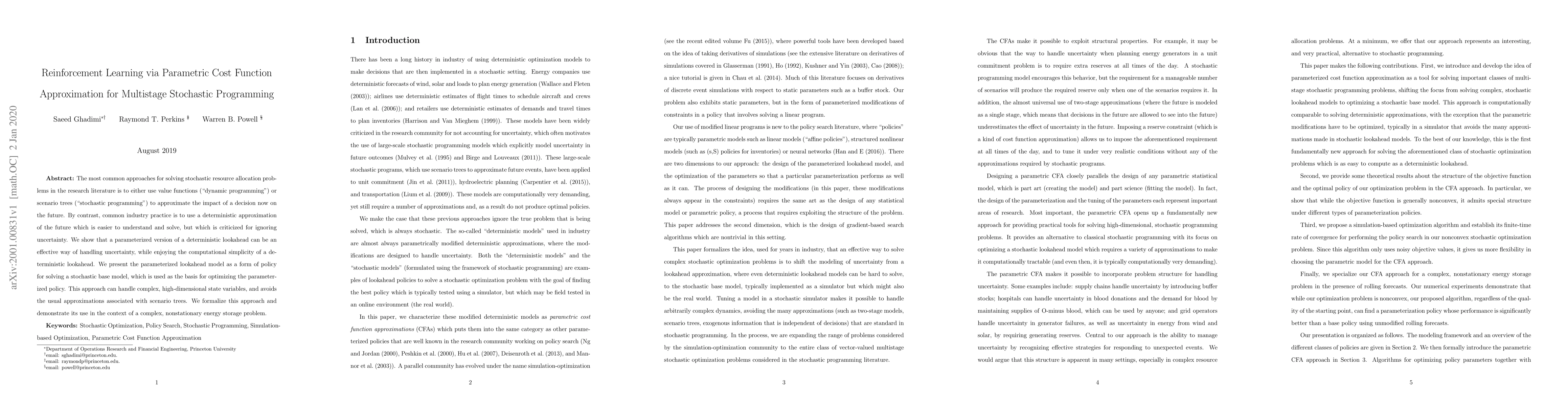 This paper proposes a reinforcement learning method using parametric cost function approximation to solve multistage stochastic programming problems. It introduces a parameterized deterministic lookahead model that effectively handles uncertainty while maintaining computational simplicity, demonstrating its application in a complex energy storage problem.