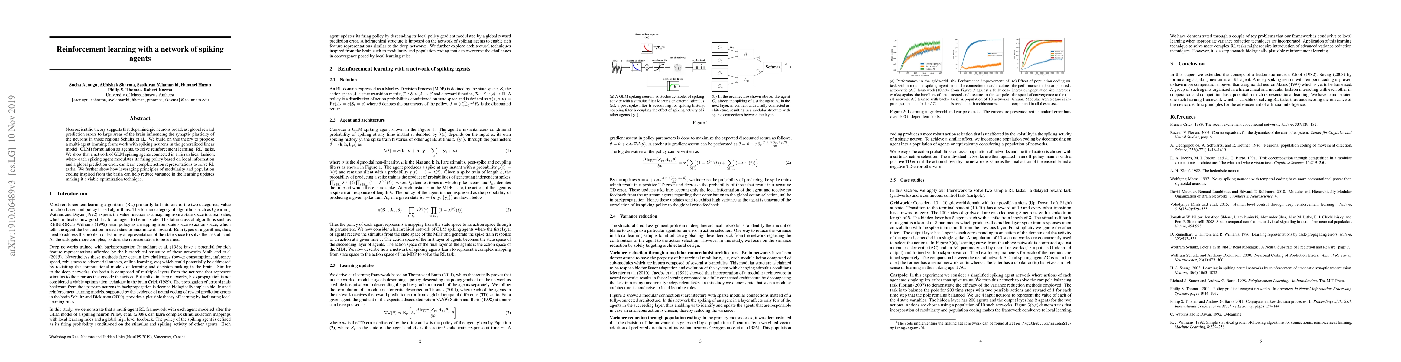 Neuroscientific theory suggests that dopaminergic neurons broadcast global reward prediction errors to large areas of the brain influencing the synaptic plasticity of the neurons in those regions. We build on this theory to propose a multi-agent learning framework with spiking neurons in the generalized linear model (GLM) formulation as agents, to solve reinforcement learning (RL) tasks. We show that a network of GLM spiking agents connected in a hierarchical fashion, where each spiking agent modulates its firing policy based on local information and a global prediction error, can learn complex action representations to solve RL tasks. We further show how leveraging principles of modularity and population coding inspired from the brain can help reduce variance in the learning updates making it a viable optimization technique.