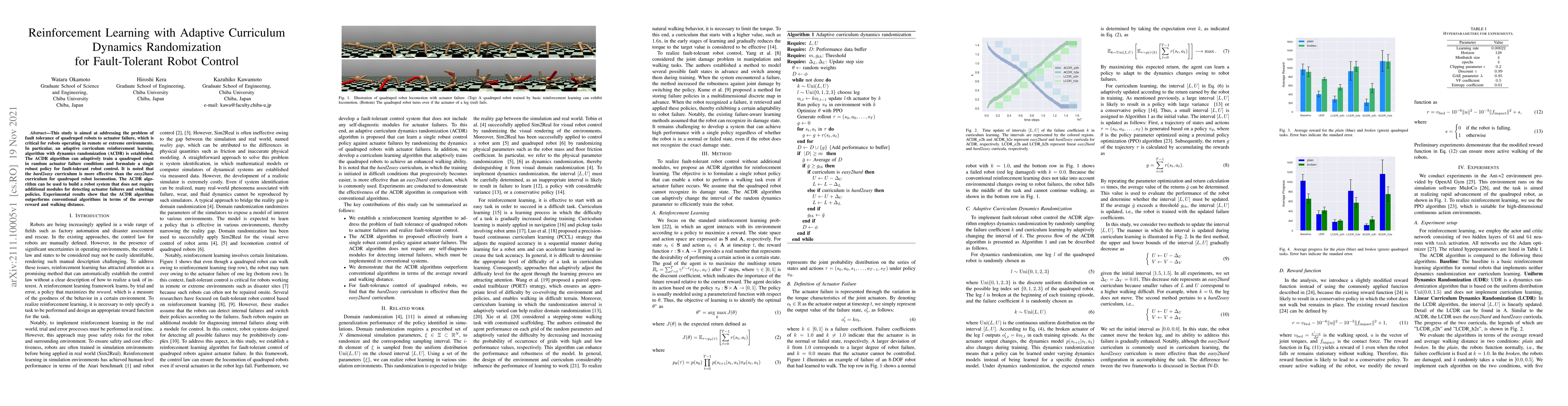 This study introduces an adaptive curriculum reinforcement learning algorithm with dynamics randomization (ACDR) for enhancing fault tolerance in quadruped robots. The ACDR algorithm effectively trains robots to handle actuator failures without additional detection modules, outperforming conventional methods in reward and walking distance.