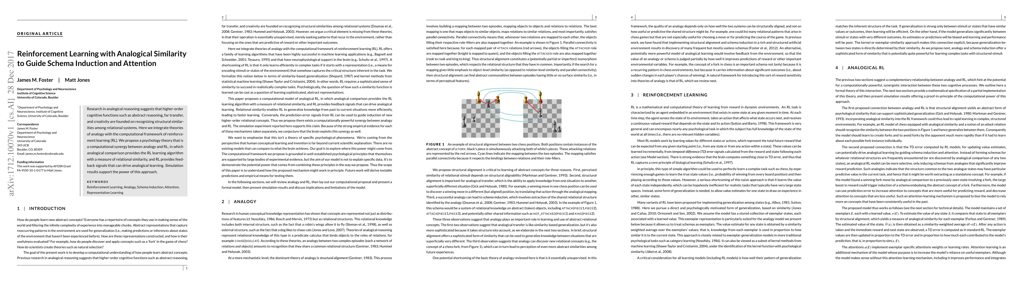 Research in analogical reasoning suggests that higher-order cognitive functions such as abstract reasoning, far transfer, and creativity are founded on recognizing structural similarities among relational systems. Here we integrate theories of analogy with the computational framework of reinforcement learning (RL). We propose a psychology theory that is a computational synergy between analogy and RL, in which analogical comparison provides the RL learning algorithm with a measure of relational similarity, and RL provides feedback signals that can drive analogical learning. Simulation results support the power of this approach.