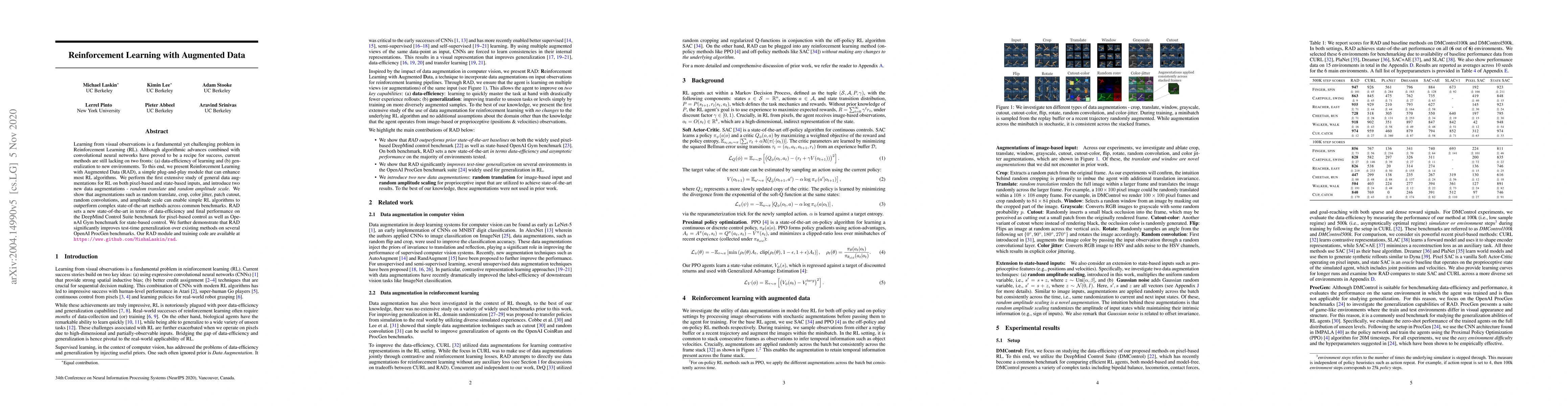 Researchers introduced Reinforcement Learning with Augmented Data (RAD), a module that improves RL algorithms' performance and generalization through data augmentation techniques, achieving state-of-the-art results on multiple benchmarks.