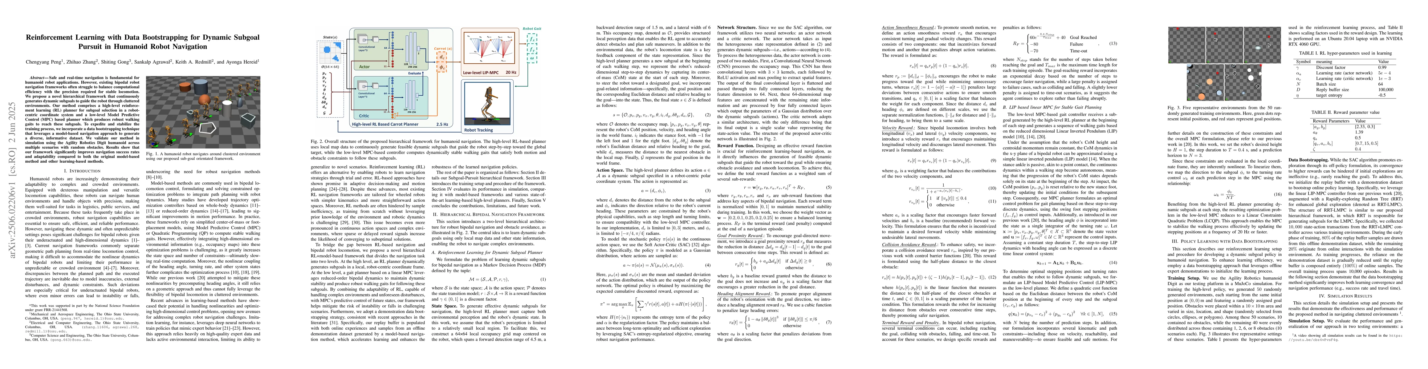 The research proposes a hierarchical framework for humanoid robot navigation, combining a high-level reinforcement learning (RL) planner for dynamic subgoal selection in a robot-centric coordinate system with a low-level Model Predictive Control (MPC) planner for producing robust walking gaits to reach these subgoals. A data bootstrapping technique, leveraging a model-based navigation approach, is used to expedite and stabilize the training process by generating a diverse, informative dataset.