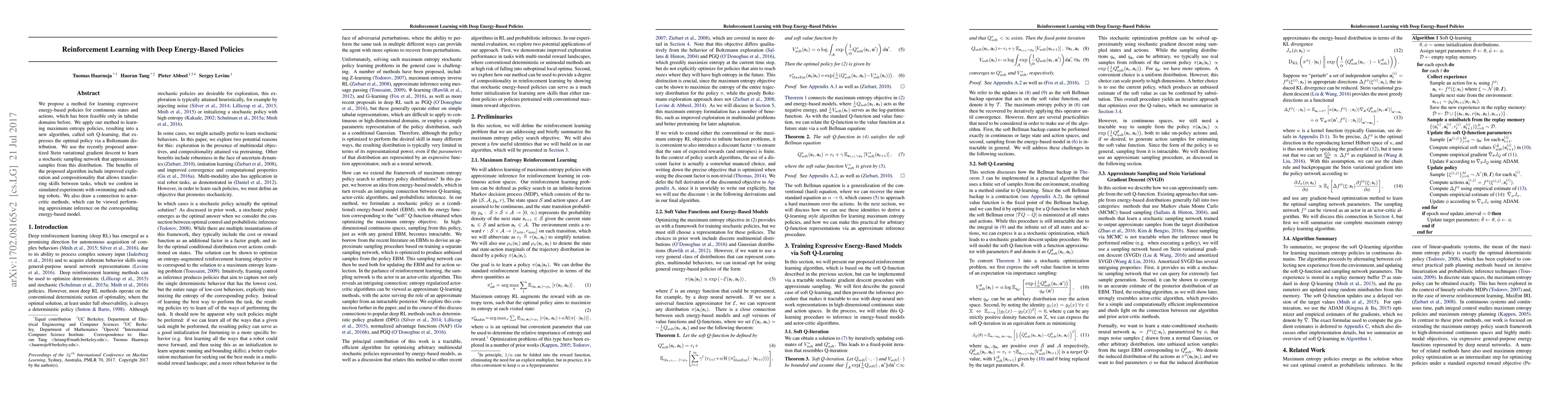 We propose a method for learning expressive energy-based policies for continuous states and actions, which has been feasible only in tabular domains before. We apply our method to learning maximum entropy policies, resulting into a new algorithm, called soft Q-learning, that expresses the optimal policy via a Boltzmann distribution. We use the recently proposed amortized Stein variational gradient descent to learn a stochastic sampling network that approximates samples from this distribution. The benefits of the proposed algorithm include improved exploration and compositionality that allows transferring skills between tasks, which we confirm in simulated experiments with swimming and walking robots. We also draw a connection to actor-critic methods, which can be viewed performing approximate inference on the corresponding energy-based model.