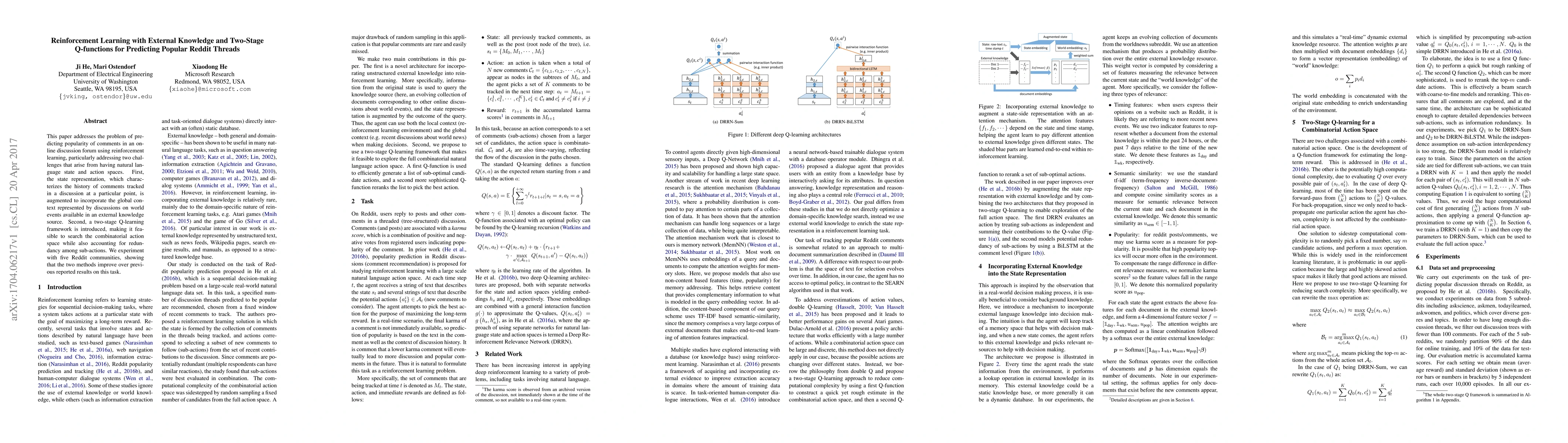 This paper proposes a reinforcement learning approach with external knowledge and a two-stage Q-learning framework to predict the popularity of comments on Reddit. It tackles the challenges of natural language state and action spaces by incorporating global context and improving search efficiency in the action space. Experiments on five Reddit communities demonstrate superior performance compared to prior methods.