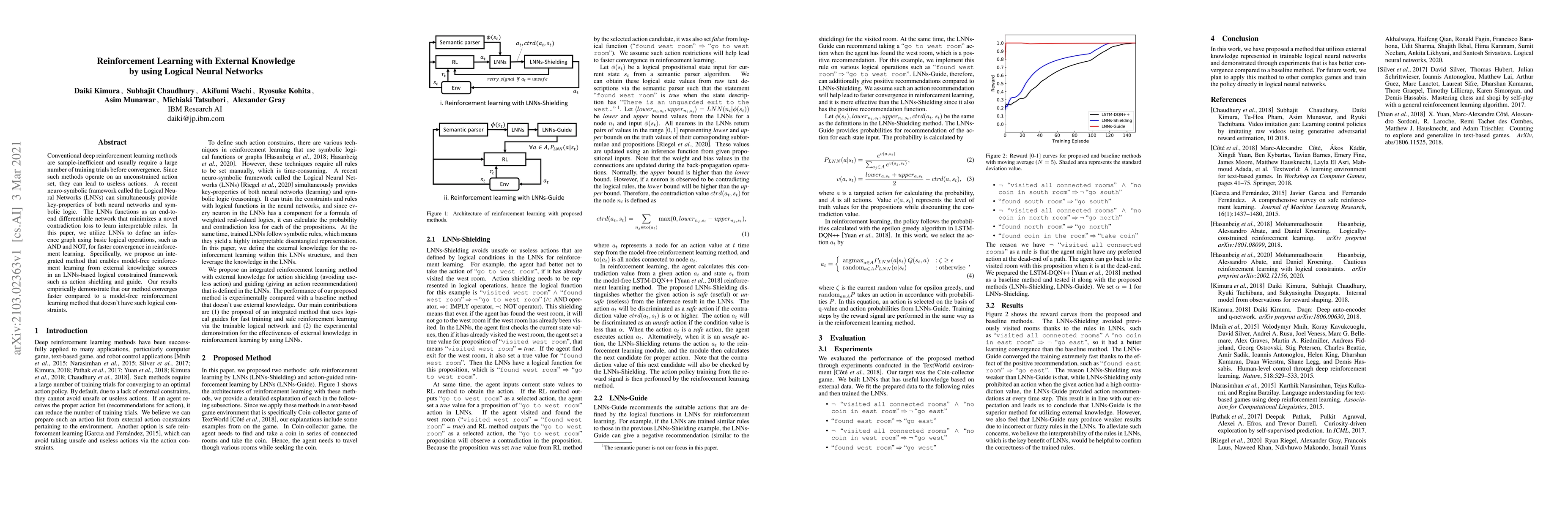 This paper proposes using Logical Neural Networks (LNNs) to enhance model-free reinforcement learning by incorporating external knowledge through logical constraints. The method demonstrates faster convergence compared to traditional methods, leveraging LNNs' ability to learn interpretable rules and minimize contradiction loss.