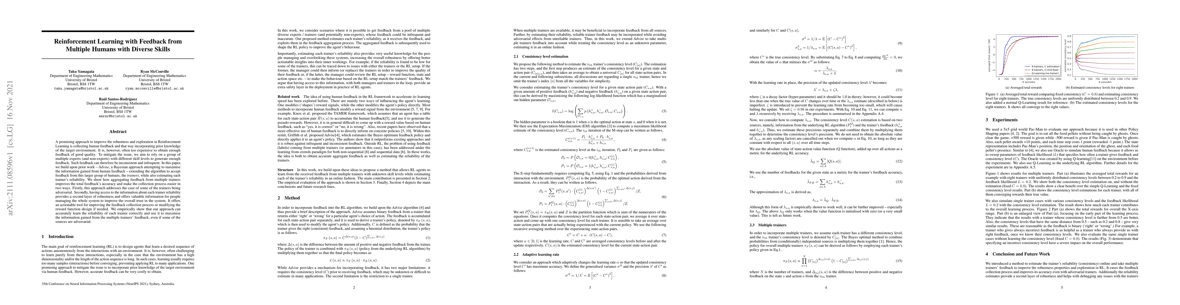 This research paper presents a method to improve reinforcement learning by collecting feedback from multiple humans with diverse skills, reducing the need for high-quality human feedback. The approach aggregates feedback, estimates trainer reliability, and provides actionable insights for improving the system.