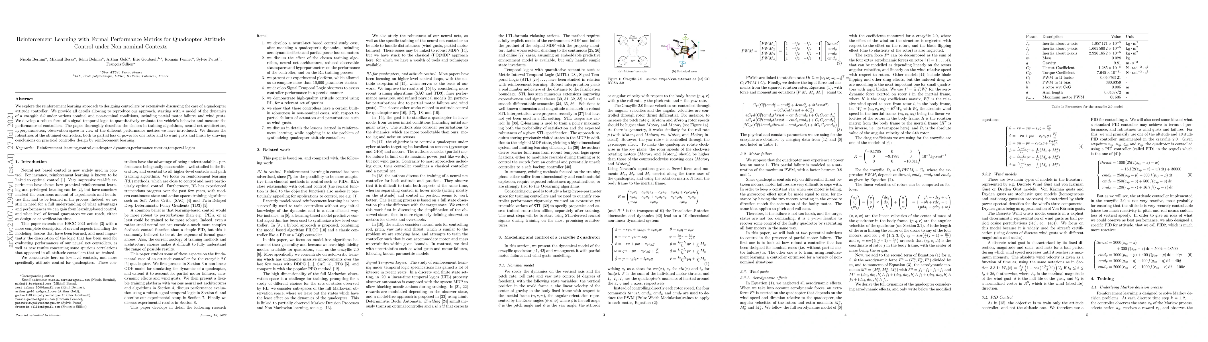 This paper investigates reinforcement learning for designing quadcopter attitude controllers under various conditions, including partial motor failures and wind gusts. It introduces a robust signal temporal logic for performance evaluation and details the training algorithms, neural network architecture, and hyperparameters used to achieve robust control.