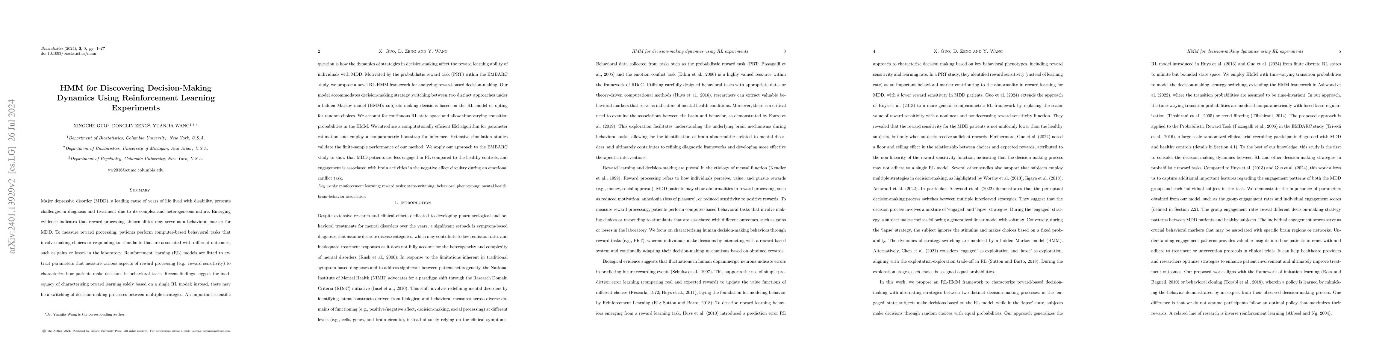 This study provides the first empirical evidence of the neural correlates of decision-making in MDD and demonstrates the potential of RL-HMM as a tool for analyzing complex behavioral data.