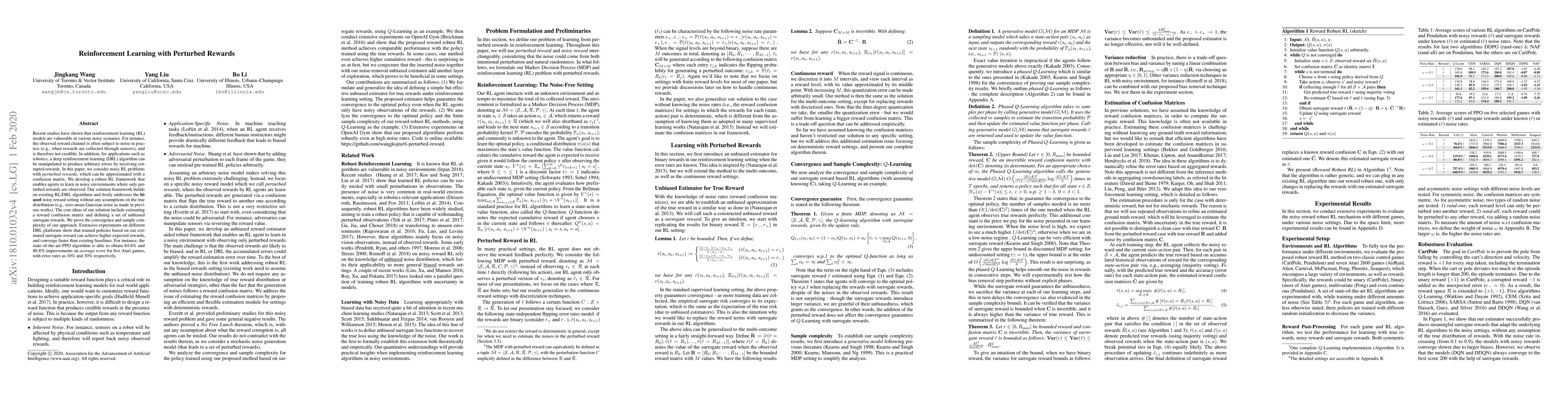 This paper develops a robust reinforcement learning framework to handle noisy environments with perturbed rewards, addressing the issue of reward channel noise without assuming specific noise distributions. The proposed method estimates a reward confusion matrix and defines unbiased surrogate rewards, achieving higher expected rewards and faster convergence compared to existing algorithms, with notable improvements in Atari game performance.