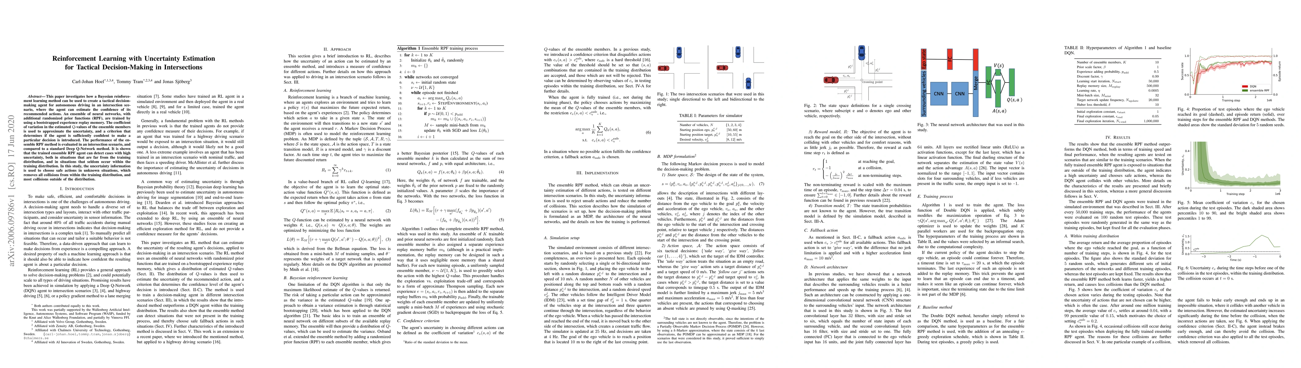 This paper investigates how a Bayesian reinforcement learning method can be used to create a tactical decision-making agent for autonomous driving in an intersection scenario, where the agent can estimate the confidence of its recommended actions. An ensemble of neural networks, with additional randomized prior functions (RPF), are trained by using a bootstrapped experience replay memory. The coefficient of variation in the estimated $Q$-values of the ensemble members is used to approximate the uncertainty, and a criterion that determines if the agent is sufficiently confident to make a particular decision is introduced. The performance of the ensemble RPF method is evaluated in an intersection scenario, and compared to a standard Deep Q-Network method. It is shown that the trained ensemble RPF agent can detect cases with high uncertainty, both in situations that are far from the training distribution, and in situations that seldom occur within the training distribution. In this study, the uncertainty information is used to choose safe actions in unknown situations, which removes all collisions from within the training distribution, and most collisions outside of the distribution.