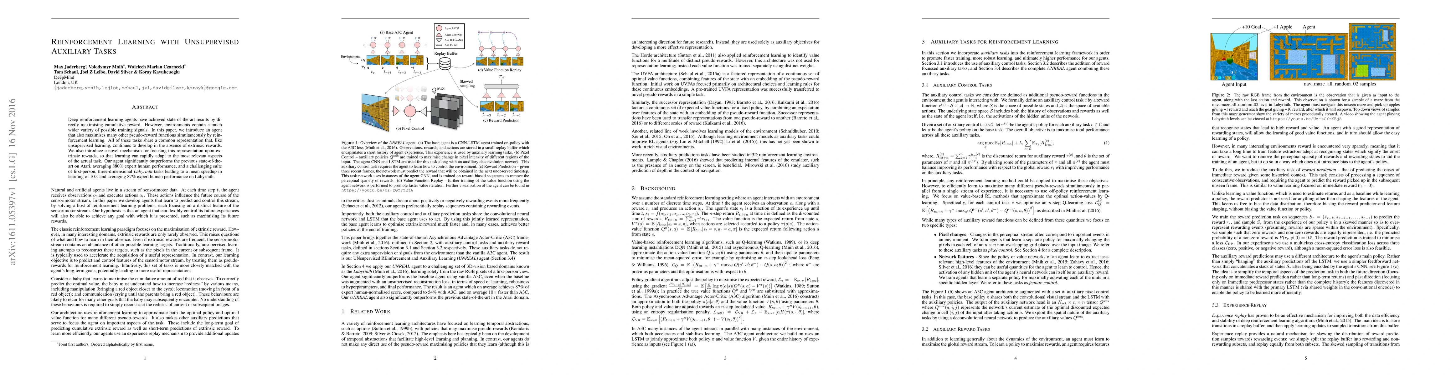 Deep reinforcement learning agents have achieved state-of-the-art results by directly maximising cumulative reward. However, environments contain a much wider variety of possible training signals. In this paper, we introduce an agent that also maximises many other pseudo-reward functions simultaneously by reinforcement learning. All of these tasks share a common representation that, like unsupervised learning, continues to develop in the absence of extrinsic rewards. We also introduce a novel mechanism for focusing this representation upon extrinsic rewards, so that learning can rapidly adapt to the most relevant aspects of the actual task. Our agent significantly outperforms the previous state-of-the-art on Atari, averaging 880\% expert human performance, and a challenging suite of first-person, three-dimensional \emph{Labyrinth} tasks leading to a mean speedup in learning of 10$\times$ and averaging 87\% expert human performance on Labyrinth.