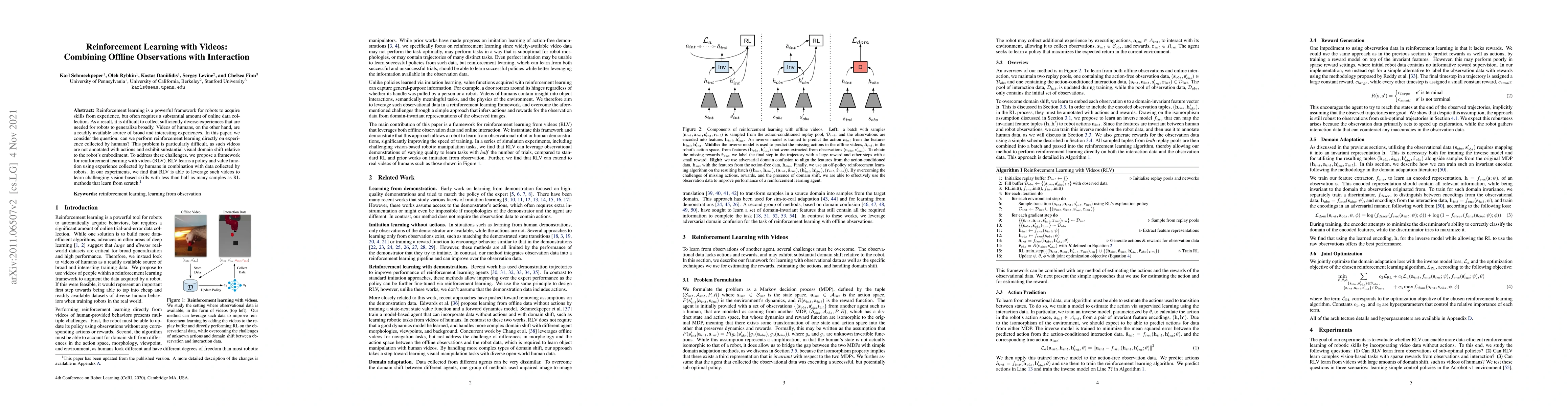This paper proposes a framework for reinforcement learning using videos of human demonstrations combined with robot interaction to reduce the need for extensive online data collection. The method, called Reinforcement Learning with Videos (RLV), successfully learns vision-based skills with fewer samples compared to traditional reinforcement learning methods.
