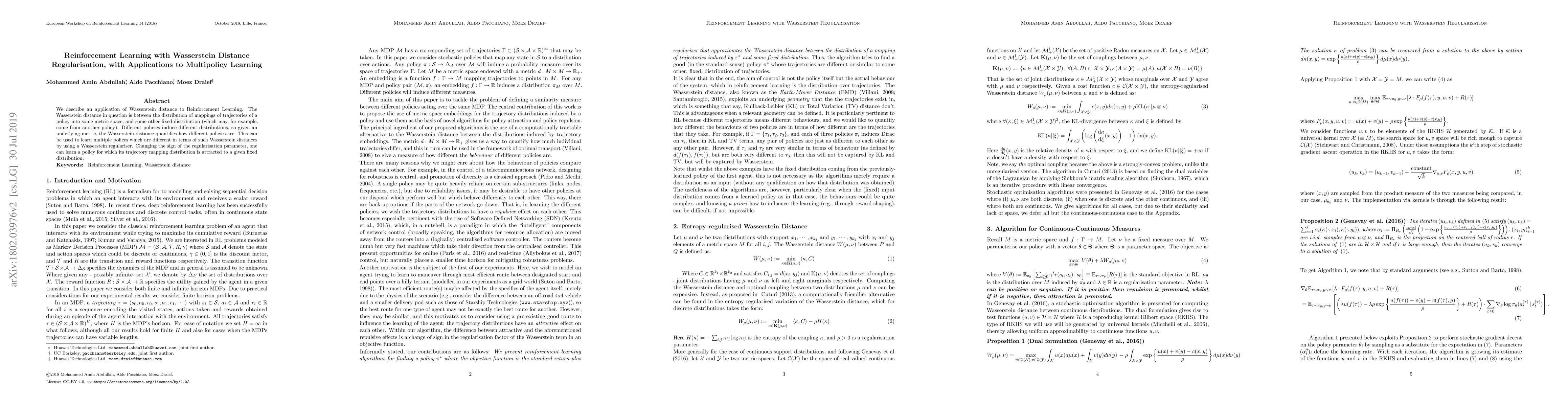 This paper applies Wasserstein distance to Reinforcement Learning to quantify differences between policy-induced distributions, using it as a regularizer to learn multiple distinct policies. By adjusting the sign of the regularization parameter, the method can also learn a policy whose trajectory distribution aligns with a specified fixed distribution.