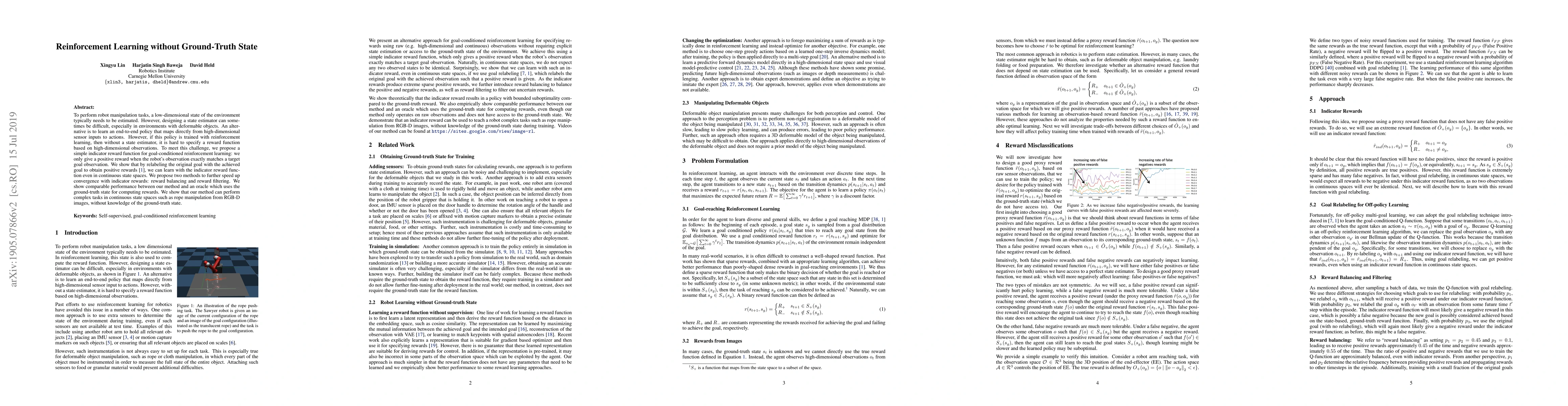 Researchers propose a novel approach to reinforcement learning without ground-truth state for robot manipulation tasks, using an indicator reward function that only provides positive rewards when the observation matches a target goal observation. Their method achieves comparable performance to using the ground-truth state, enabling robots to perform complex tasks in continuous state spaces.