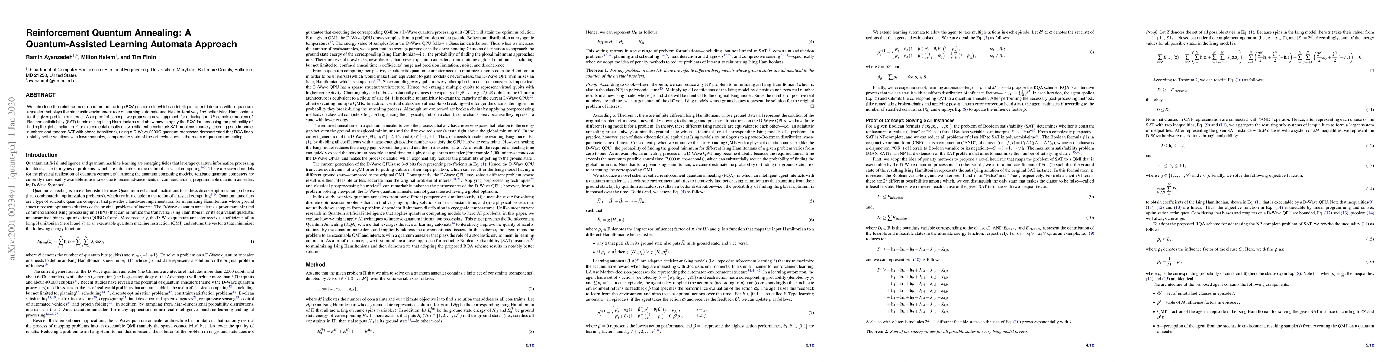 The paper proposes reinforcement quantum annealing (RQA) to iteratively find better Ising Hamiltonians for NP-complete problems, specifically Boolean satisfiability (SAT). Experimental results on benchmark SAT problems using a D-Wave 2000Q quantum processor show that RQA finds better solutions with fewer samples than state-of-the-art techniques.