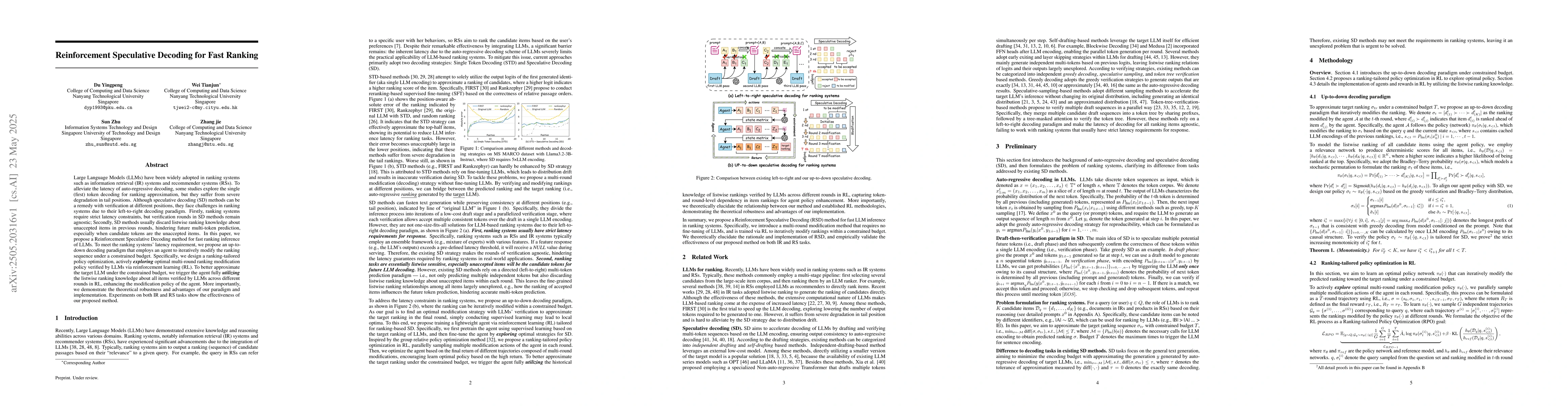 A new method called Reinforcement Speculative Decoding is proposed for fast ranking inference of Large Language Models, addressing latency constraints and enhancing multi-round prediction with listwise ranking knowledge.
