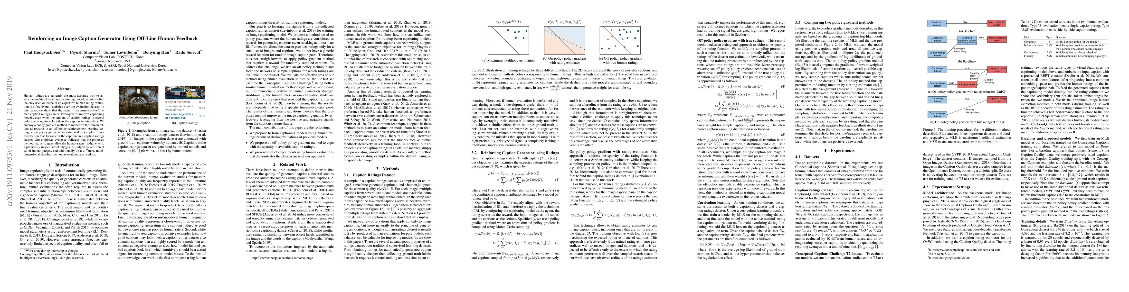 Human ratings are currently the most accurate way to assess the quality of an image captioning model, yet most often the only used outcome of an expensive human rating evaluation is a few overall statistics over the evaluation dataset. In this paper, we show that the signal from instance-level human caption ratings can be leveraged to improve captioning models, even when the amount of caption ratings is several orders of magnitude less than the caption training data. We employ a policy gradient method to maximize the human ratings as rewards in an off-policy reinforcement learning setting, where policy gradients are estimated by samples from a distribution that focuses on the captions in a caption ratings dataset. Our empirical evidence indicates that the proposed method learns to generalize the human raters' judgments to a previously unseen set of images, as judged by a different set of human judges, and additionally on a different, multi-dimensional side-by-side human evaluation procedure.