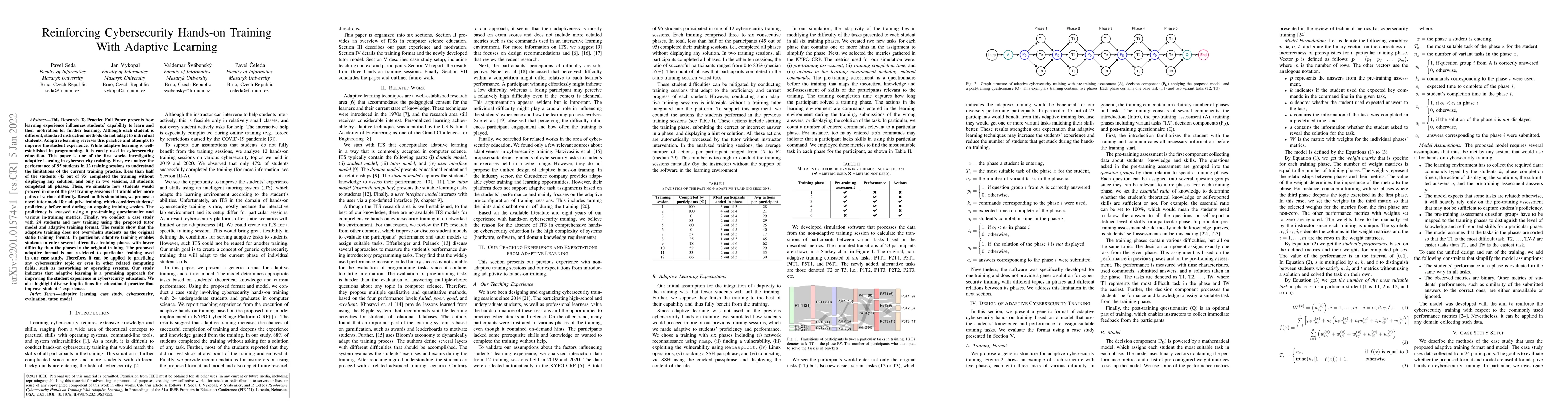 This paper presents how learning experience influences students' capability to learn and their motivation for learning. Although each student is different, standard instruction methods do not adapt to individuals. Adaptive learning reverses this practice and attempts to improve the student experience. While adaptive learning is well-established in programming, it is rarely used in cybersecurity education. This paper is one of the first works investigating adaptive learning in security training. First, we analyze the performance of 95 students in 12 training sessions to understand the limitations of the current training practice. Less than half of the students completed the training without displaying a solution, and only in two sessions, all students completed all phases. Then, we simulate how students would proceed in one of the past training sessions if it would offer more paths of various difficulty. Based on this simulation, we propose a novel tutor model for adaptive training, which considers students' proficiency before and during an ongoing training session. The proficiency is assessed using a pre-training questionnaire and various in-training metrics. Finally, we conduct a study with 24 students and new training using the proposed tutor model and adaptive training format. The results show that the adaptive training does not overwhelm students as the original static training. Adaptive training enables students to enter several alternative training phases with lower difficulty than the original training. The proposed format is not restricted to a particular training. Therefore, it can be applied to practicing any security topic or even in related fields, such as networking or operating systems. Our study indicates that adaptive learning is a promising approach for improving the student experience in security education. We also highlight implications for educational practice.